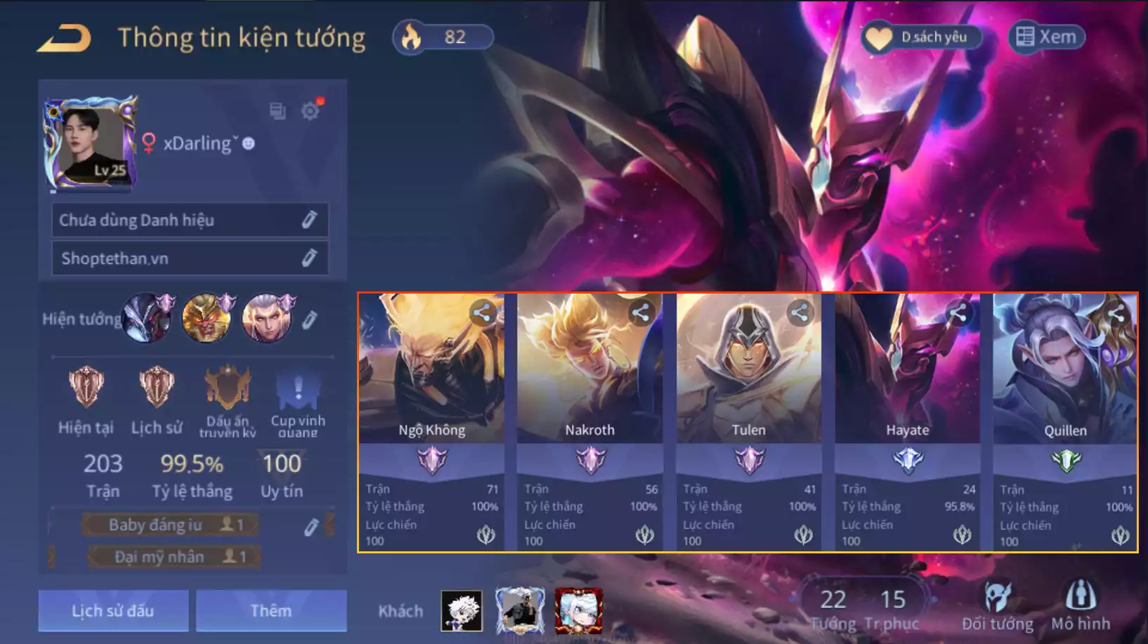Nakroth lôi quang sứ, Tulen tân thần hoàng kim, Ngộ không siêu việt 2.0, Quillen ngịch thiên long đế, Hayate tử thần vũ trụ, trắng thông tin