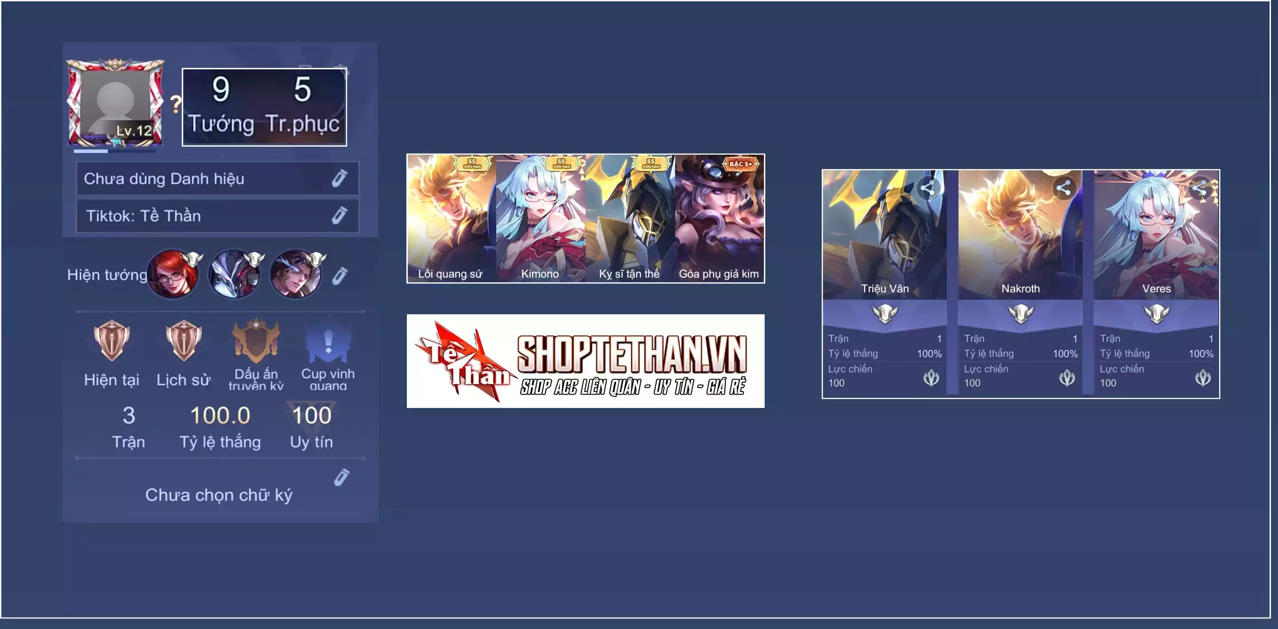 Acc #20562: Nakroth lôi quang sứ, Veres kimono, Triệu vân kỵ sĩ tận thế, sẵn tướng cả 3, dư vàng, trắng thông tin, giá 1,500,000 đ
