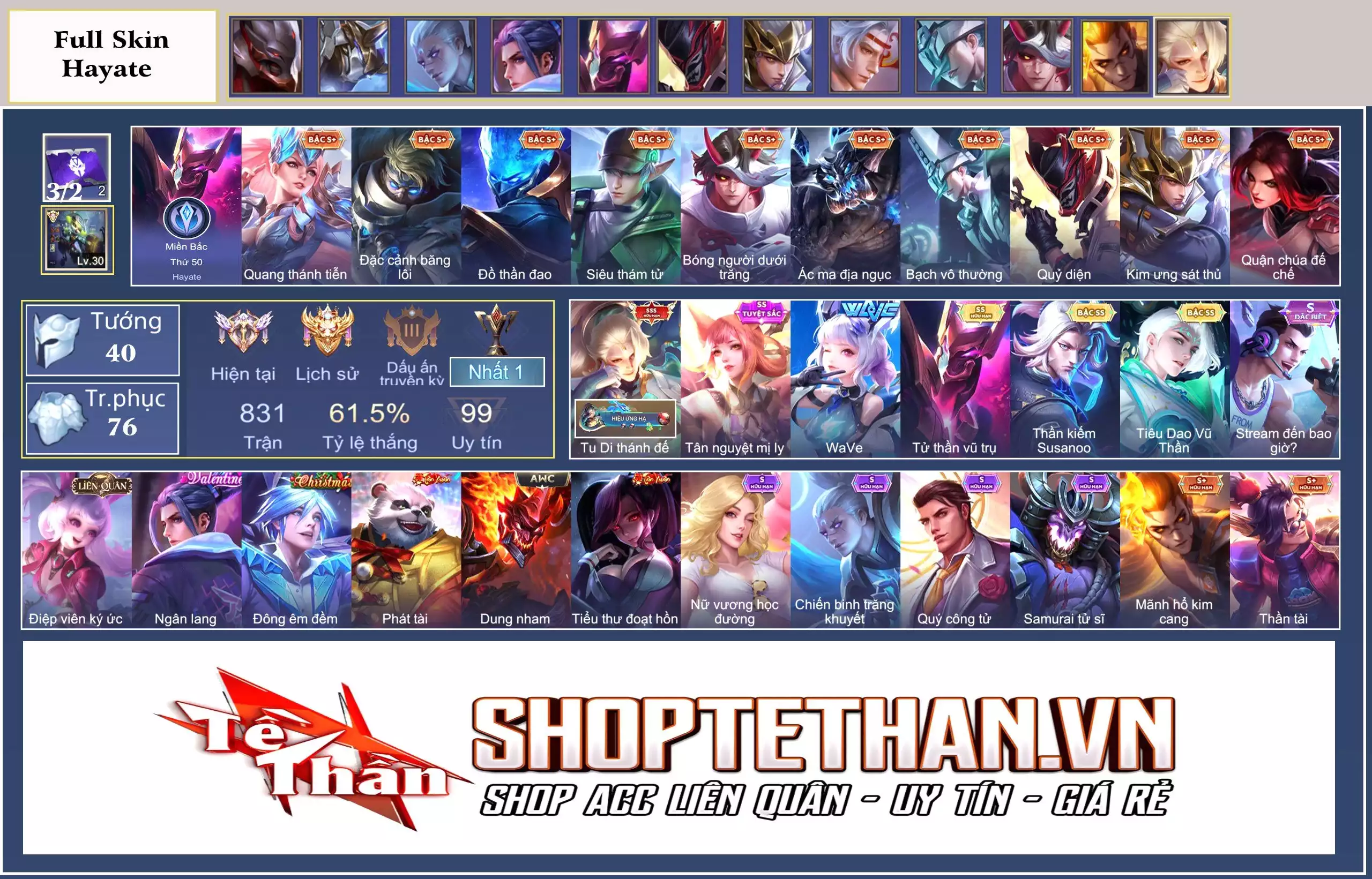 Acc #20729: FULL SKIN HAYATE, Lili wave+tuyệt sắc, Tulen tiêu dao ..., giá 2,300,000 đ