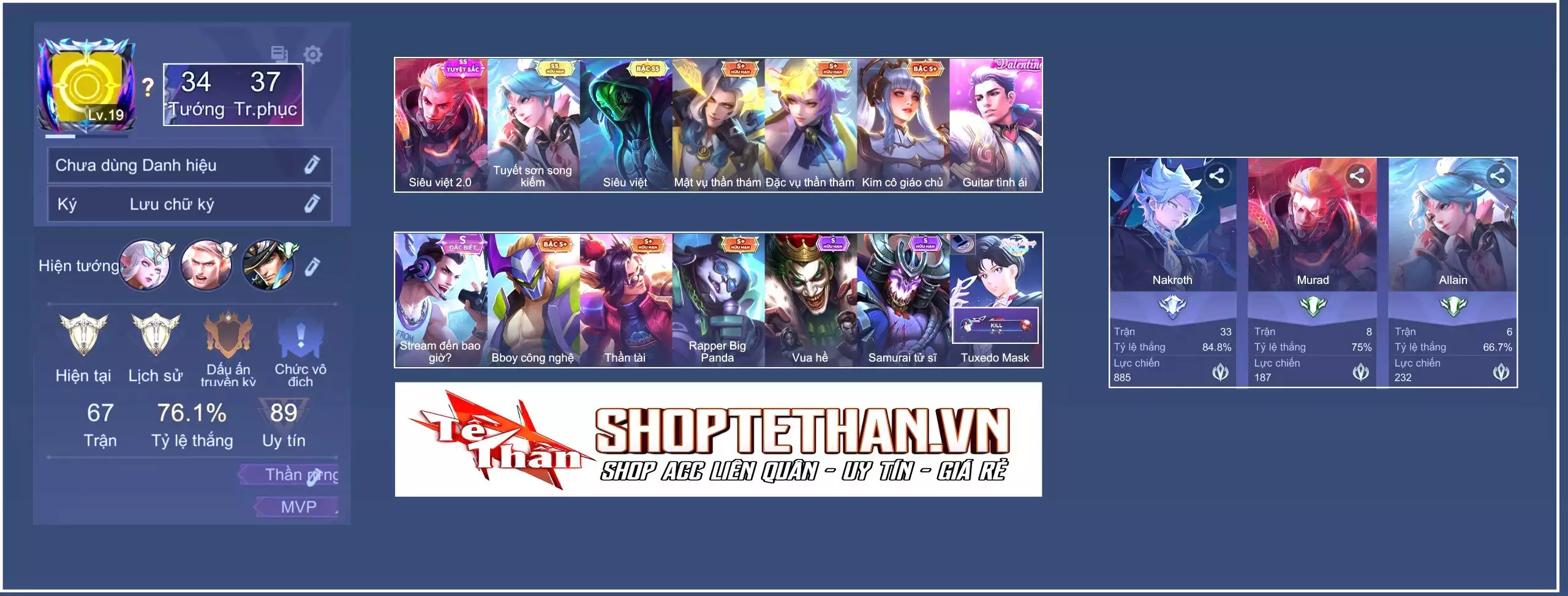 Loại acc | MUA ACC LIÊN QUÂN VIP: SKIN SSS, ANIME, CỤC VÀNG, MÁC THÁCH ĐẤU |