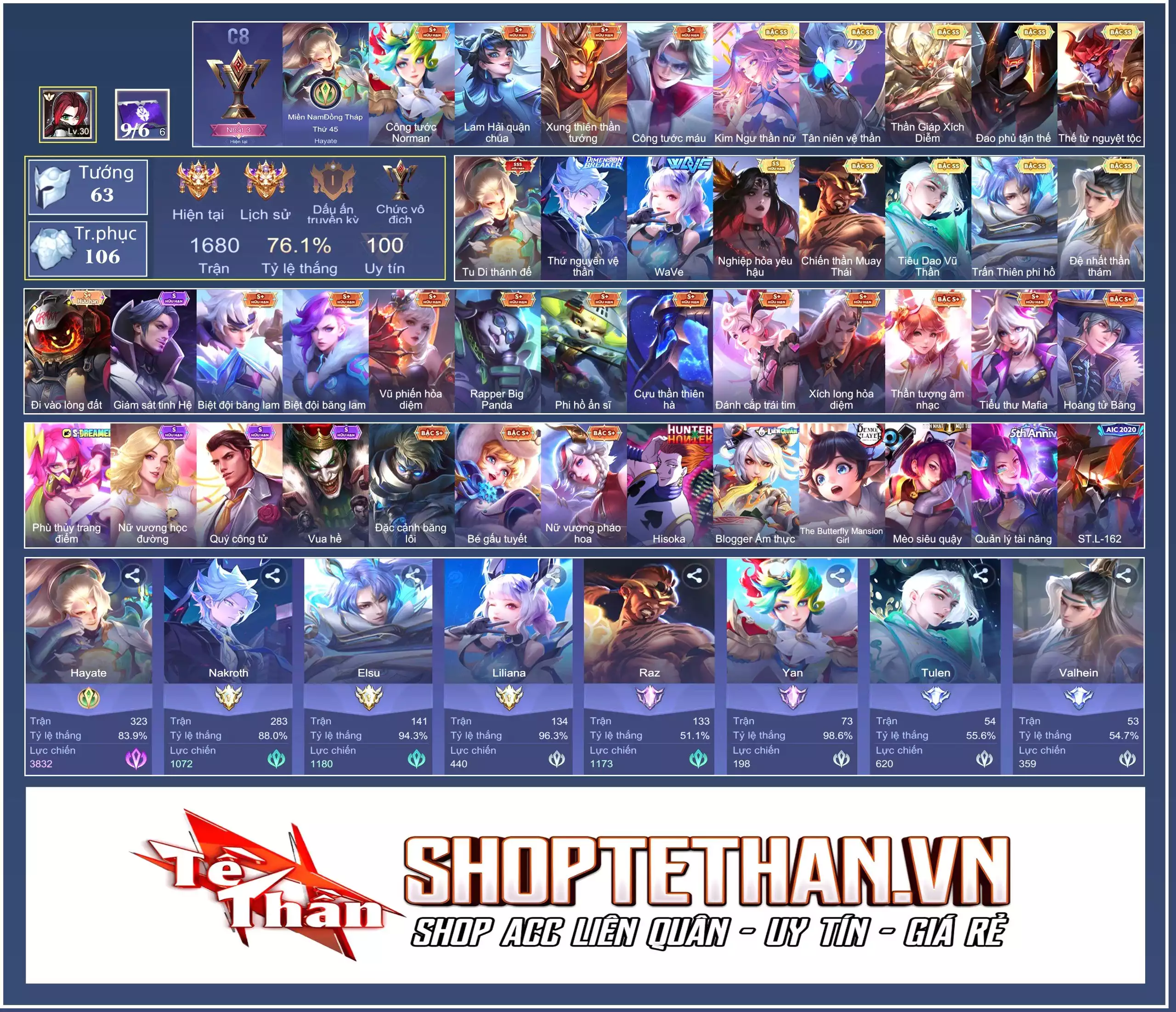 Loại acc | MUA ACC LIÊN QUÂN VIP: SKIN SSS, ANIME, CỤC VÀNG, MÁC THÁCH ĐẤU |