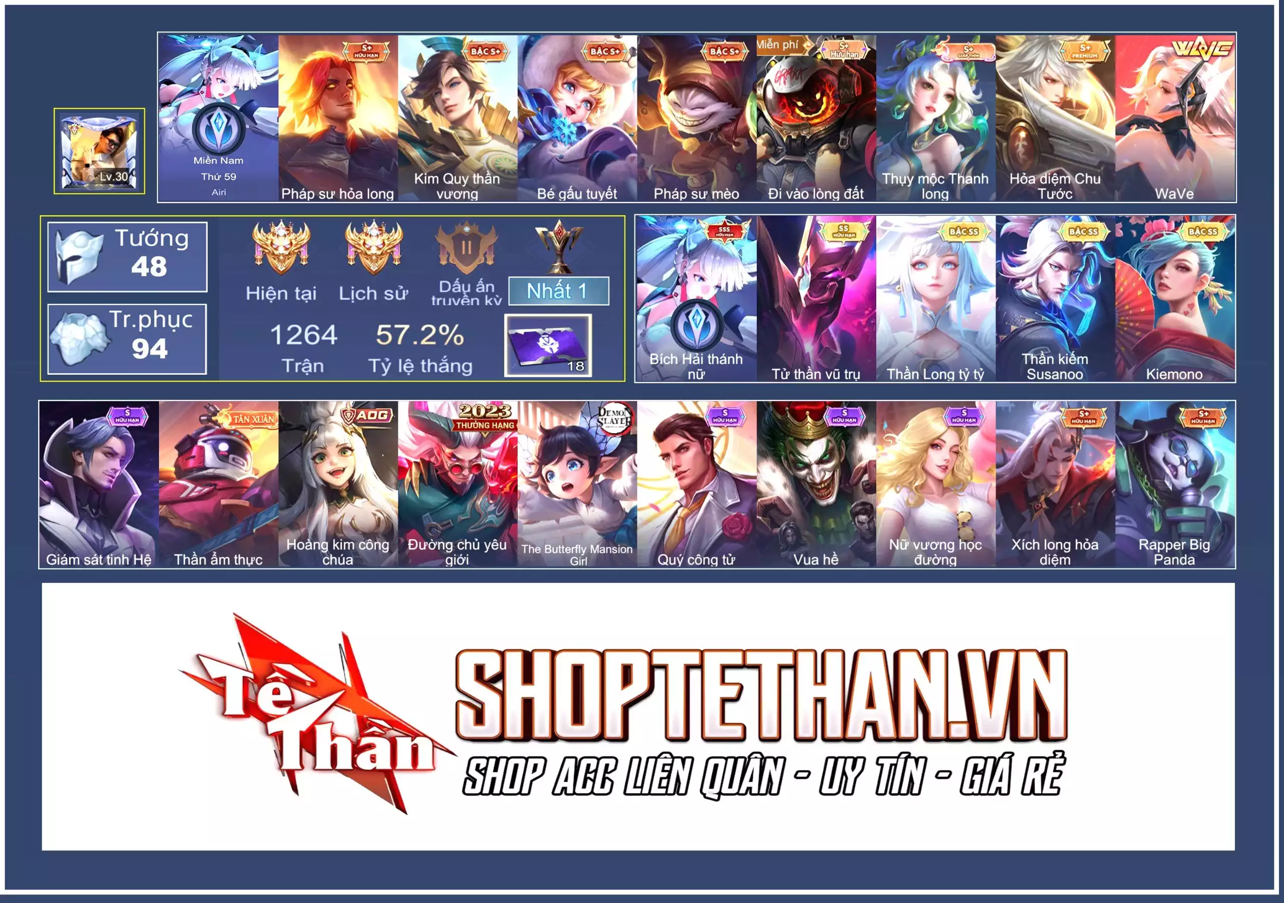 Loại acc | MUA ACC LIÊN QUÂN VIP: SKIN SSS, ANIME, CỤC VÀNG, MÁC THÁCH ĐẤU |