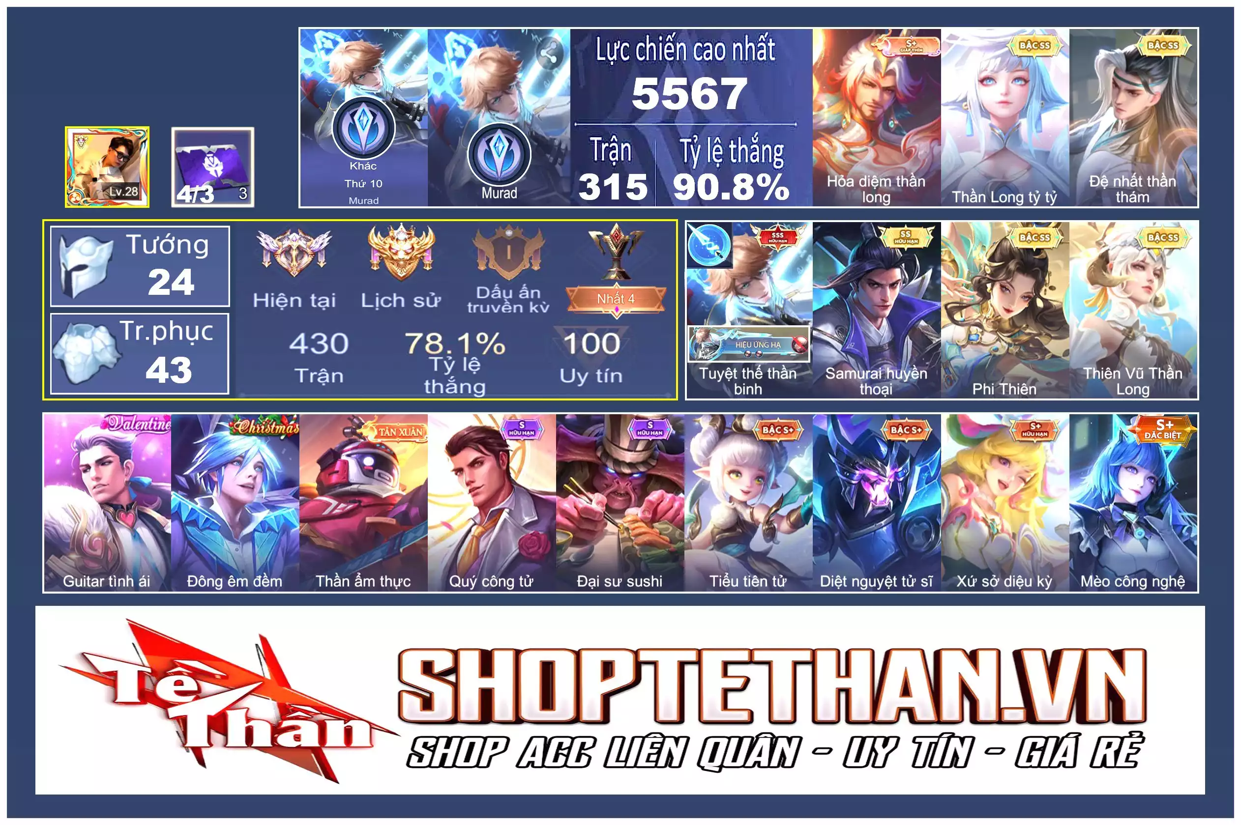 Acc #27450: Murad thần binh, Ryo samurai, Lau phi thiên, Tel thần long, Vio tỷ tỷ .... Trắng Thông Tin, giá 1,900,000 đ
