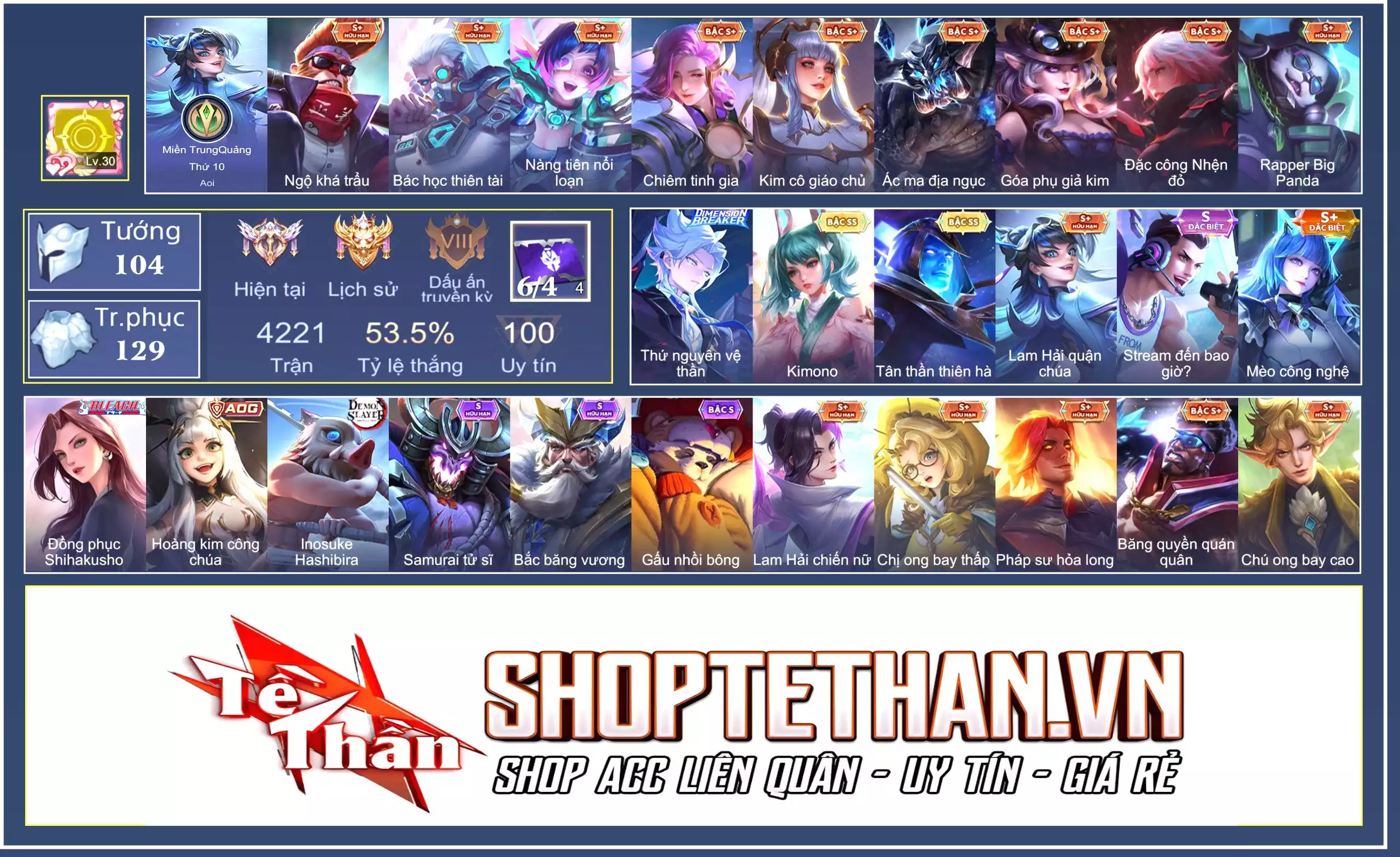 Loại acc | MUA ACC LIÊN QUÂN VIP: SKIN SSS, ANIME, CỤC VÀNG, MÁC THÁCH ĐẤU |
