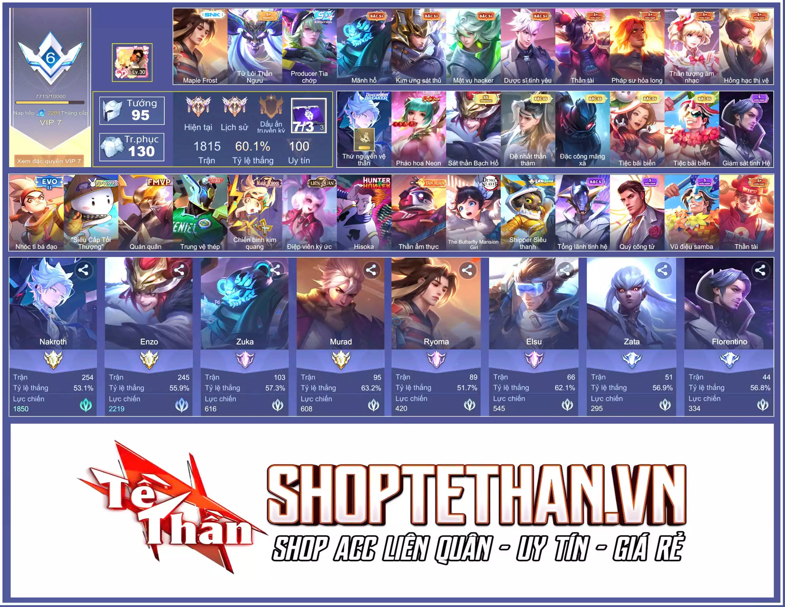 Acc #41965: Nakroth thứ nguyên vệ thần, Violet pháo hoa, Enzo sát thần, Vahien đệ nhất thần thám..., giá 2,050,000 đ