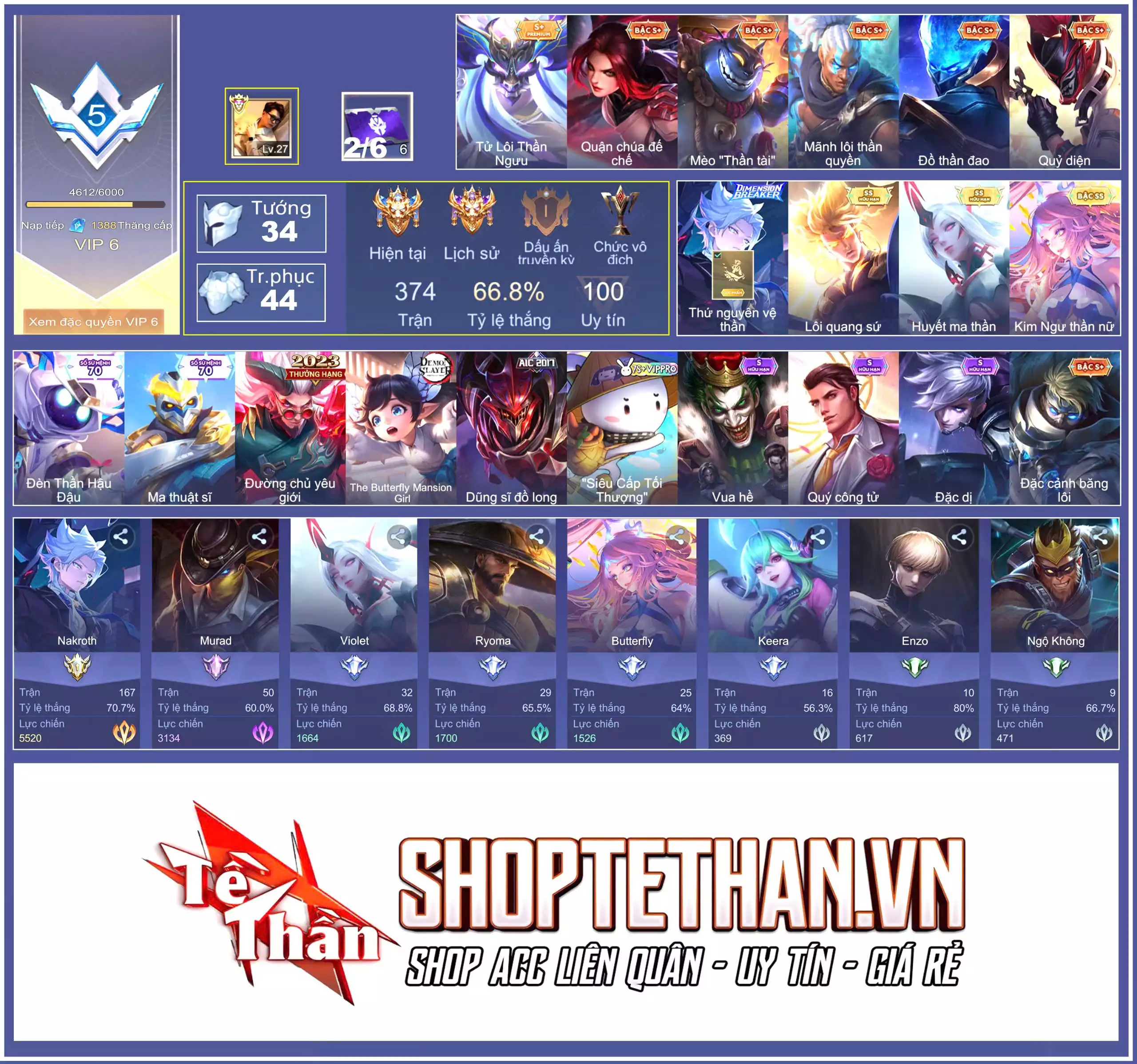 Acc #42004: Nakroth thứ nguyên vệ thần + lôi quang sứ, Violet huyết ma thần, Butter kim ngư thần nữ...MỖI SĐT, giá 2,000,000 đ