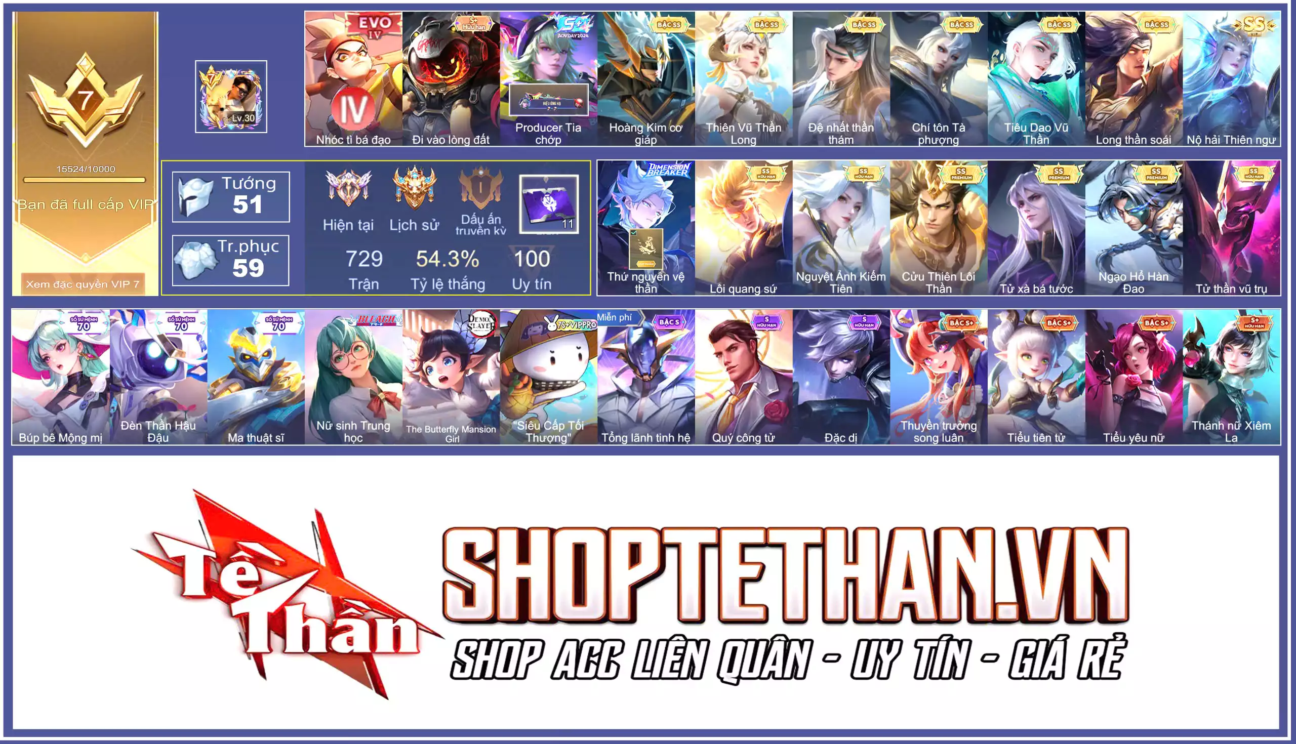 Loại acc | MUA ACC LIÊN QUÂN VIP: SKIN SSS, ANIME, CỤC VÀNG, MÁC THÁCH ĐẤU |