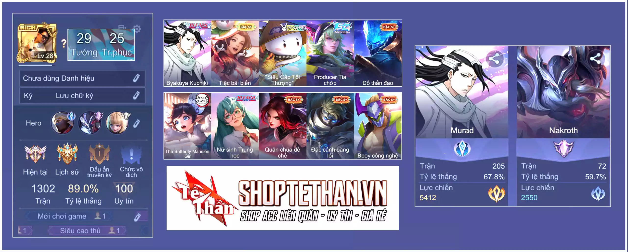 MUA ACC LIÊN QUÂN VIP: SKIN SSS, ANIME, CỤC VÀNG, MÁC THÁCH ĐẤU