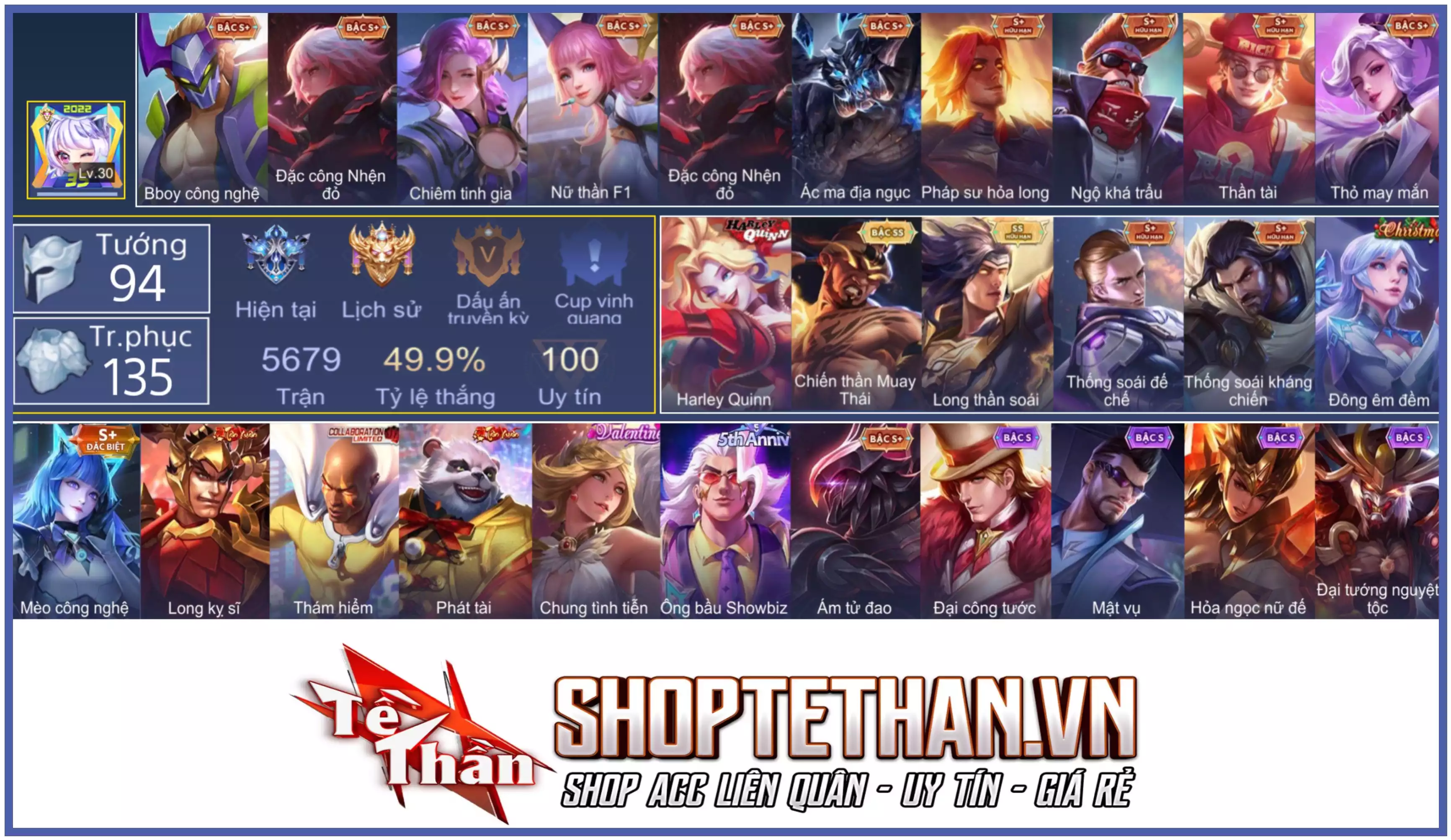| Loại acc | MUA ACC LIÊN QUÂN VIP: SKIN SSS, ANIME, CỤC VÀNG, MÁC THÁCH ĐẤU |