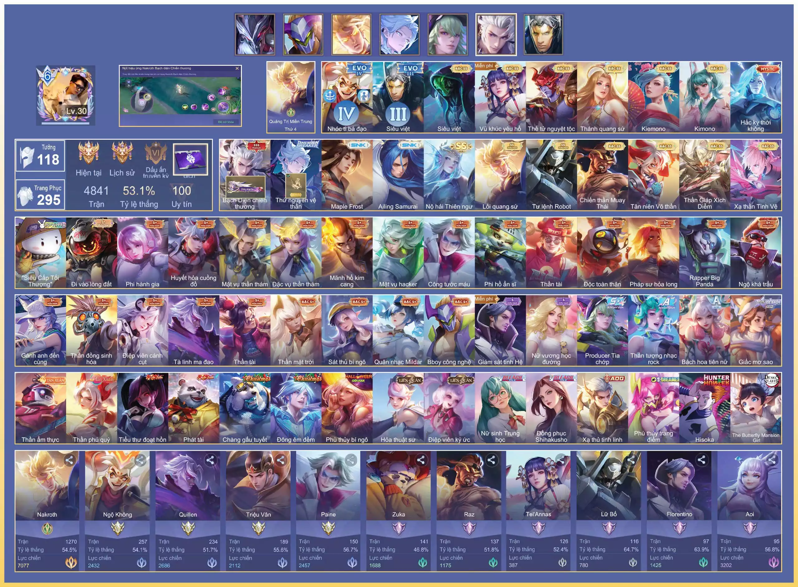 Acc #42624: Nakroth thứ nguyên vệ thần, Nakroth Bạch diện chiến thương, Ryoma maple frost, Nak lôi quang sứ, Lữu Bố robot, Raz thái, Khỉ tân niên + xích diễm..., giá 3,500,000 đ