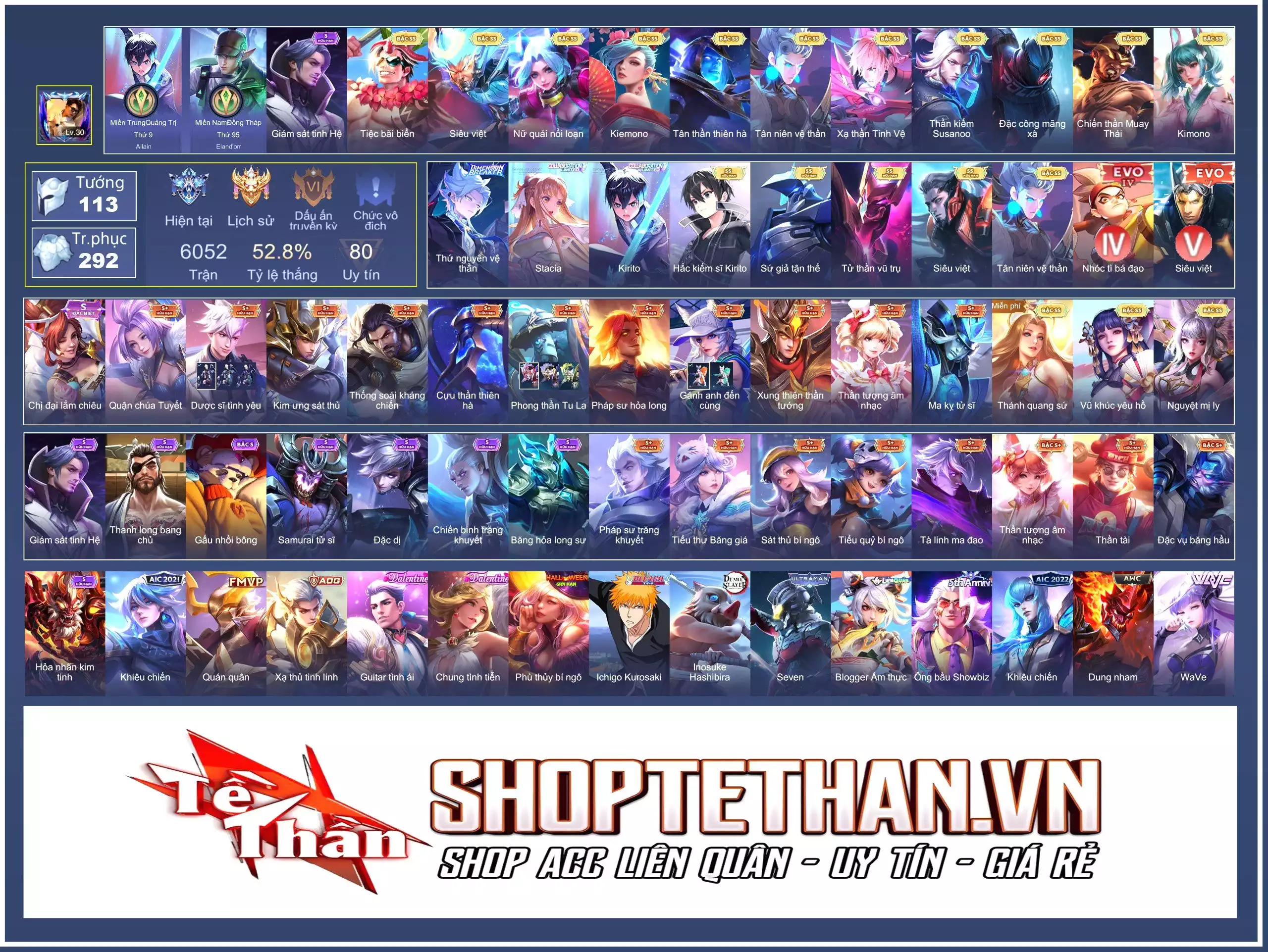 | Loại acc | MUA ACC LIÊN QUÂN VIP: SKIN SSS, ANIME, CỤC VÀNG, MÁC THÁCH ĐẤU |