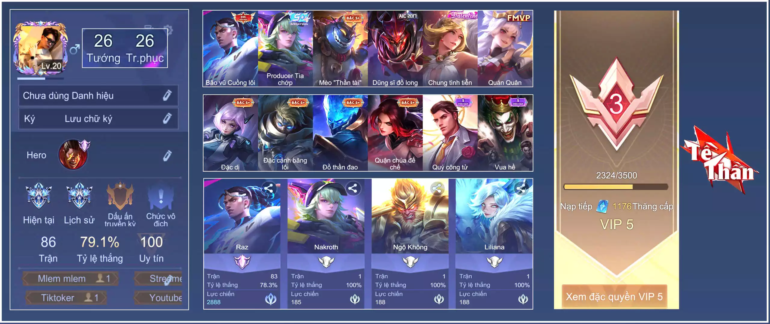 Loại acc | MUA ACC LIÊN QUÂN VIP: SKIN SSS, ANIME, CỤC VÀNG, MÁC THÁCH ĐẤU |