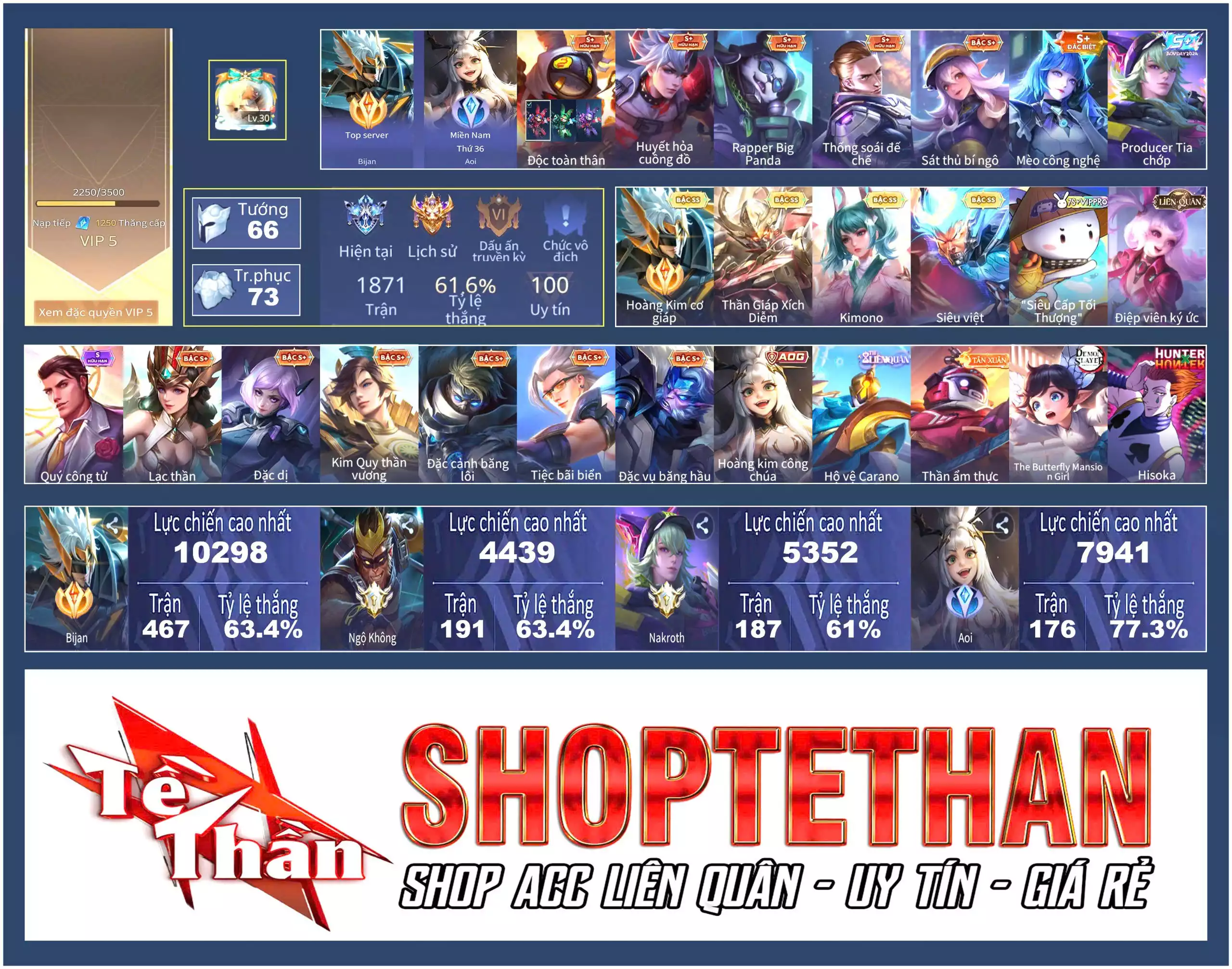 | Loại acc | MUA ACC LIÊN QUÂN VIP: SKIN SSS, ANIME, CỤC VÀNG, MÁC THÁCH ĐẤU |