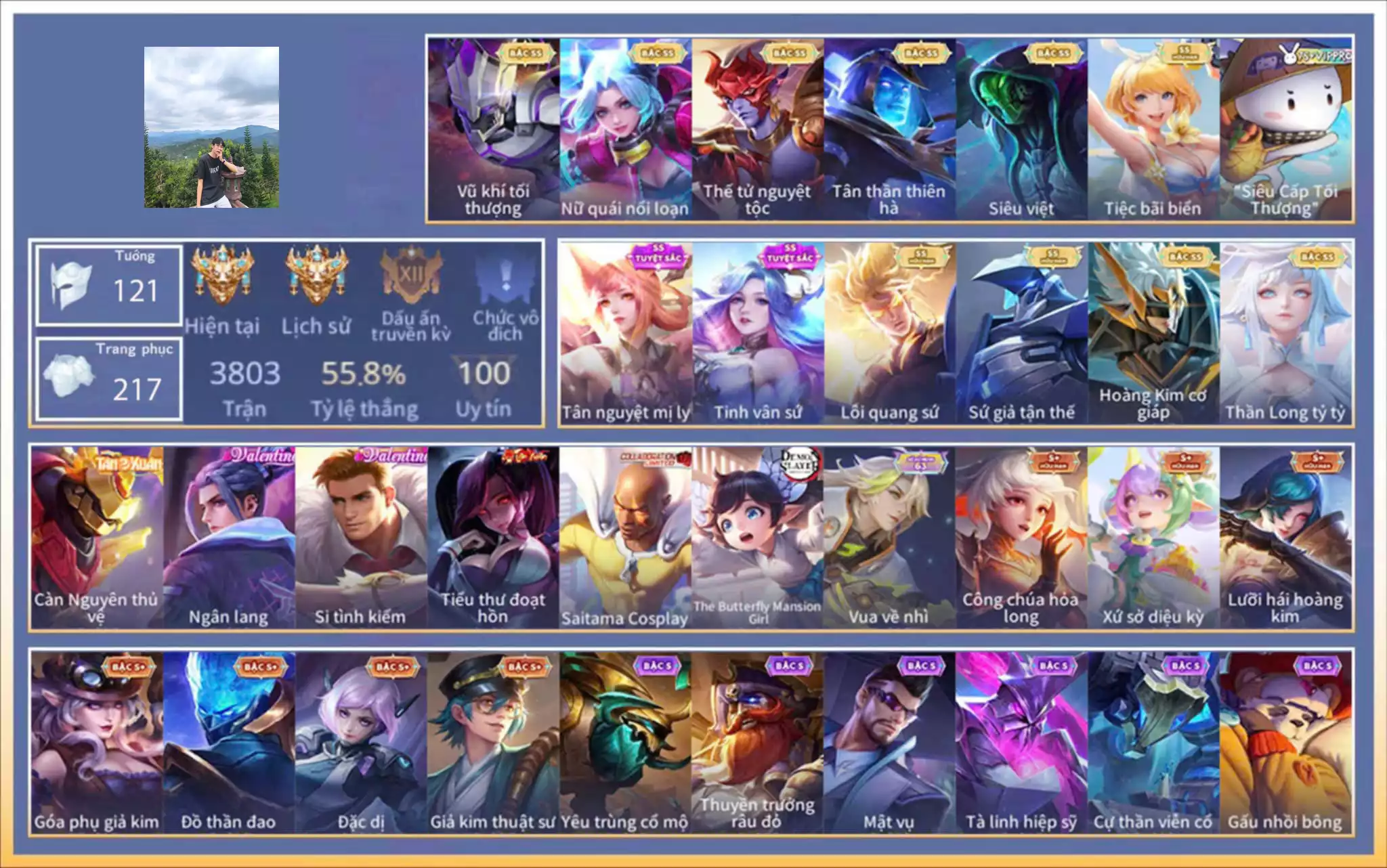 Valhein Vũ khí tối thượng, Raz Siêu việt, Yorn Thế Tử Nguyệt Tộc, Violet Tiệc bãi biển, Violet Thần long tỷ tỷ, Tulen Tân Thần Thiên Hà, Butterfly Nữ Quái Nổi Loạn, Nakroth Lôi Quang Sứ, Elsu Sứ giả tận thế, Bijan Hoàng kim cơ giáp ...