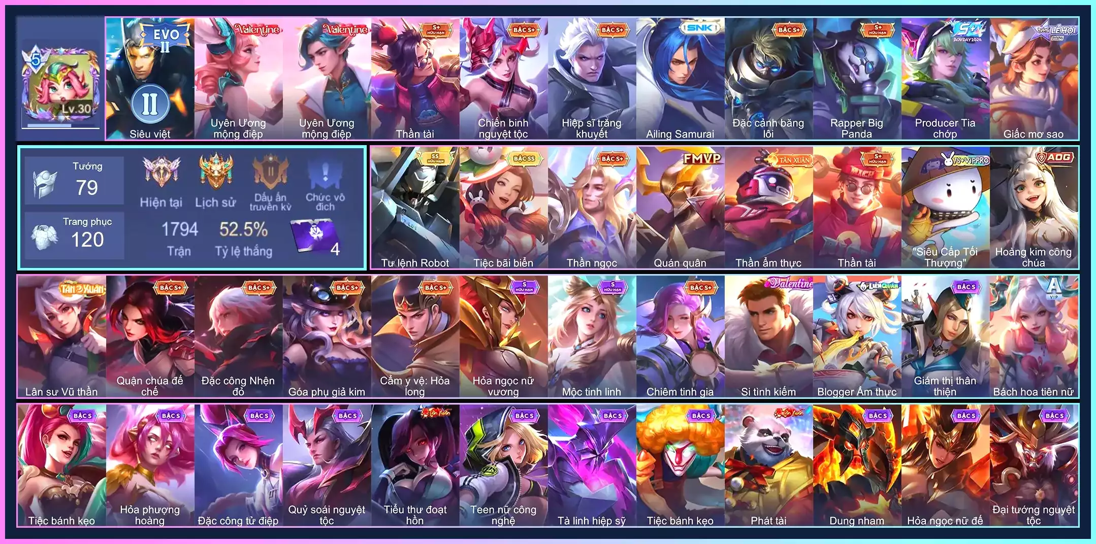 Acc #55165: Lữ Bố Tư Lệnh Robot, Lữ Bố Thần Ngọc, Điêu Thuyền Tiệc Bãi Biển, Aoi Hoàng Kim Công Chúa, Slimz Thỏ Bảy Màu,...Trắng all thông tin, giá 333,000 đ