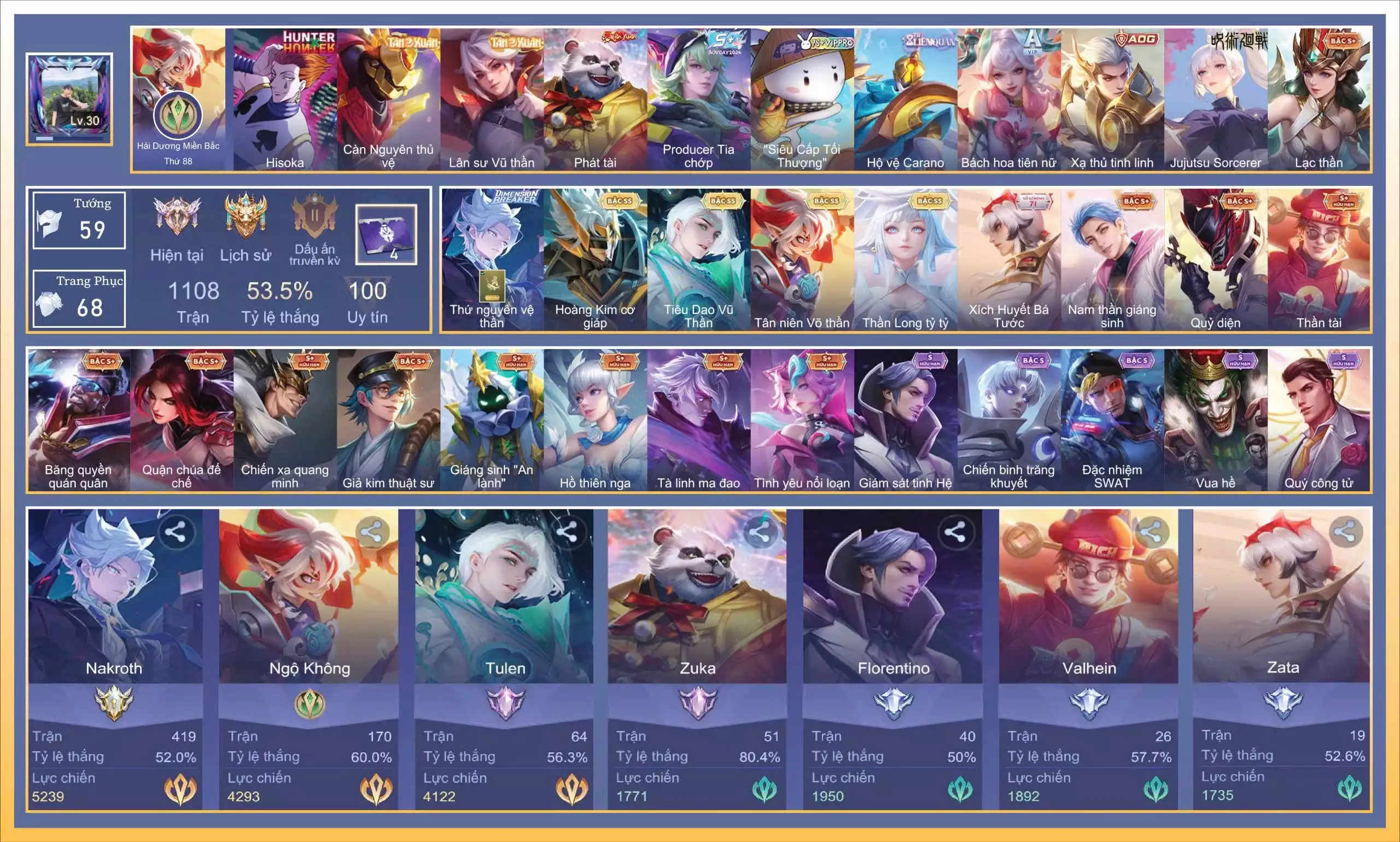 Acc #57443: Nakroth thứ nguyên vệ thần, Violet Thần long tỷ tỷ, Ngộ Không Tân niên Võ Thần, Tulen Tiêu Dao Vũ Thần, Bijan Hoàng kim cơ giáp Violet Thần long tỷ tỷ, Ngộ Không Tân niên Võ Thần, Tulen Tiêu Dao Vũ Thần, Bijan Hoàng kim cơ giáp …, giá 2,200,000 đ
