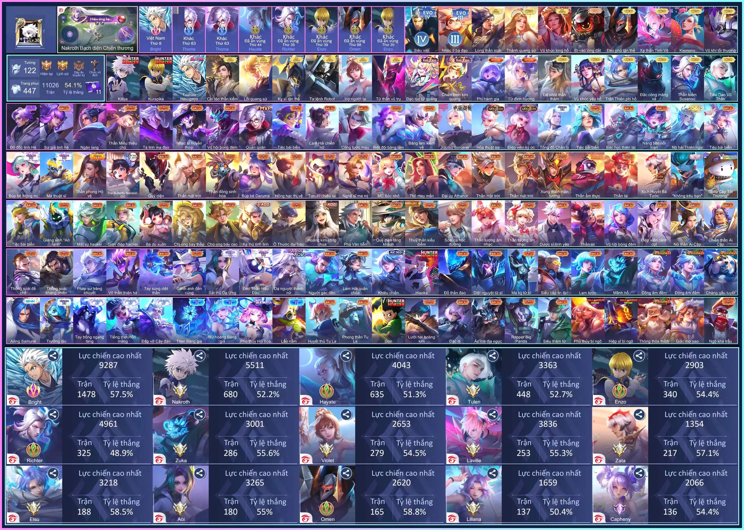 Acc #58285: Nakroth Kiilua, Enzo Kurapika, Bright Toshiro, Murad Chí Tôn, Triệu Vân Kỵ Sĩ,.., giá 3,500,000 đ