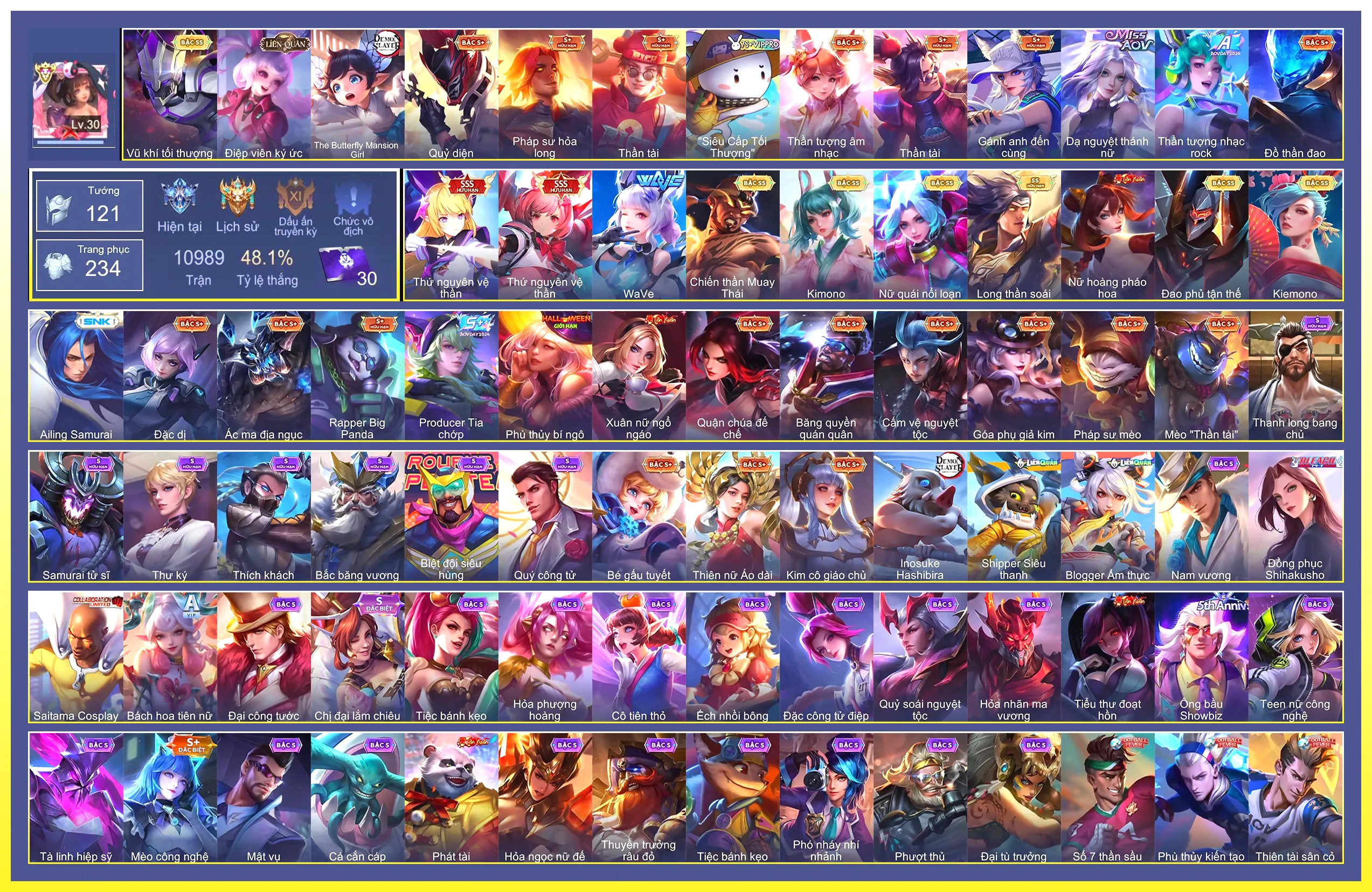 Loại acc | MUA ACC LIÊN QUÂN VIP: SKIN SSS, ANIME, CỤC VÀNG, MÁC THÁCH ĐẤU |