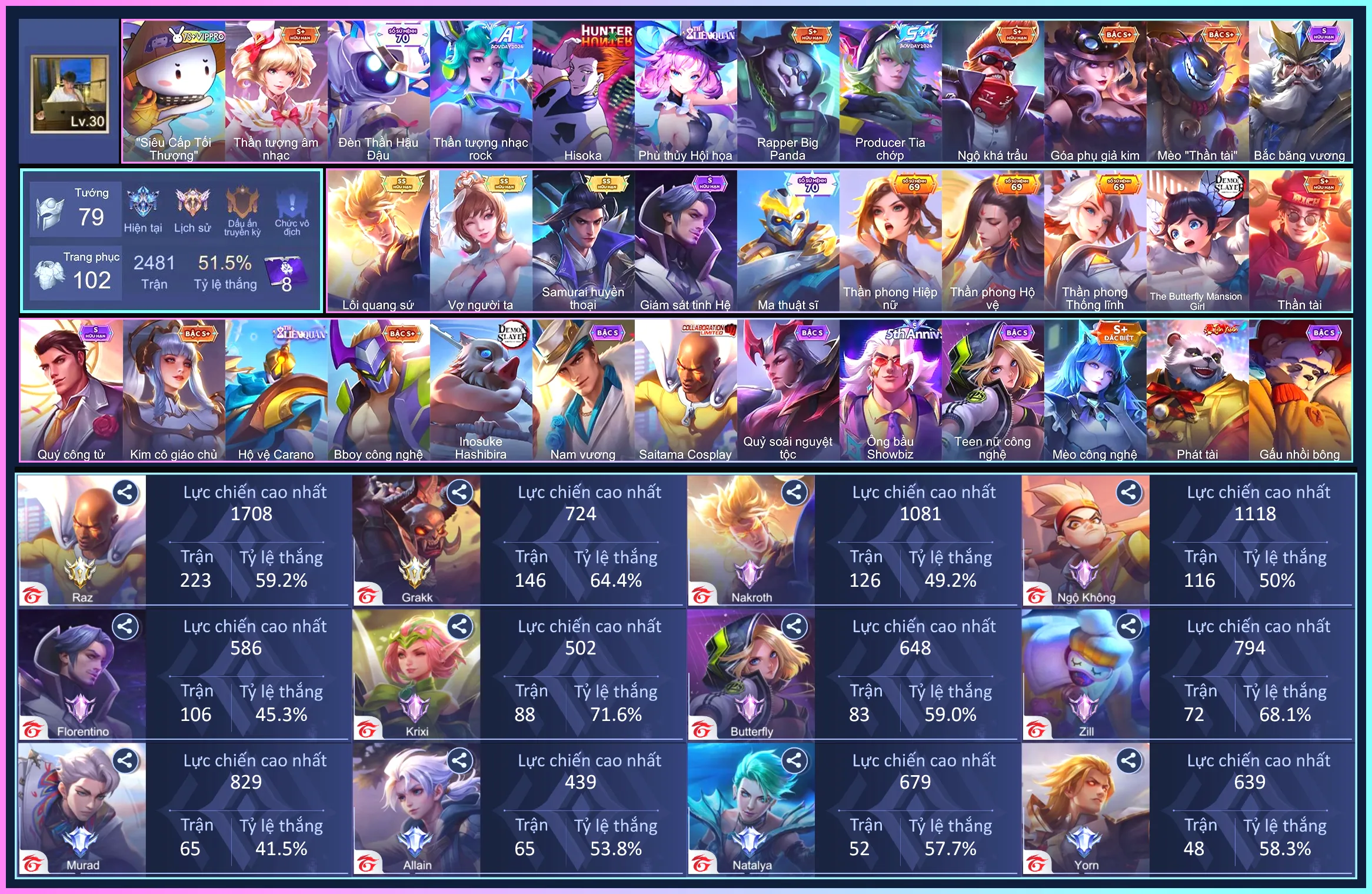 Acc #58658: Nak Lôi, Violet Vợ Người Ta, Ryoma Samurai, Flo Tinh Hệ,.., giá 900,000 đ