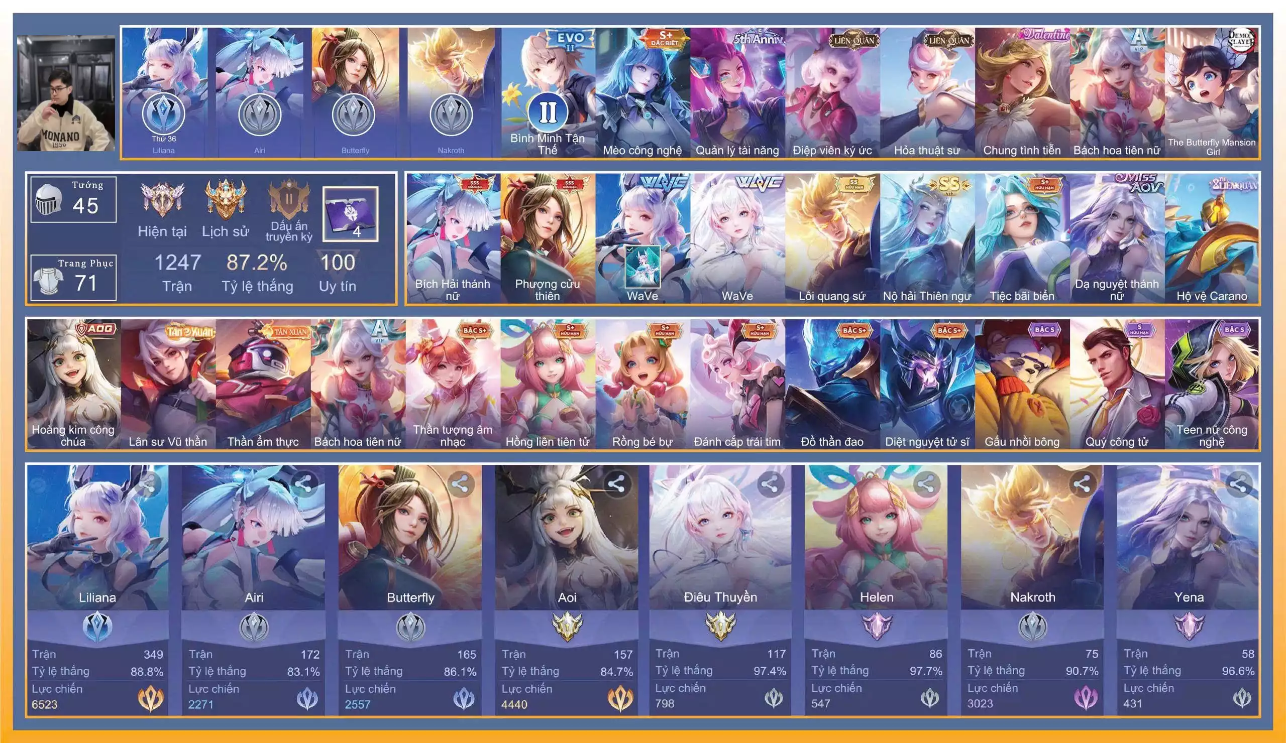 Acc #59963: Butterfly Phượng Cửu Thiên, Airi Bích hải thánh nữ, Điêu Thuyền WaVe, Liliana WaVe, Nakroth Lôi Quang Sứ, giá 2,500,000 đ