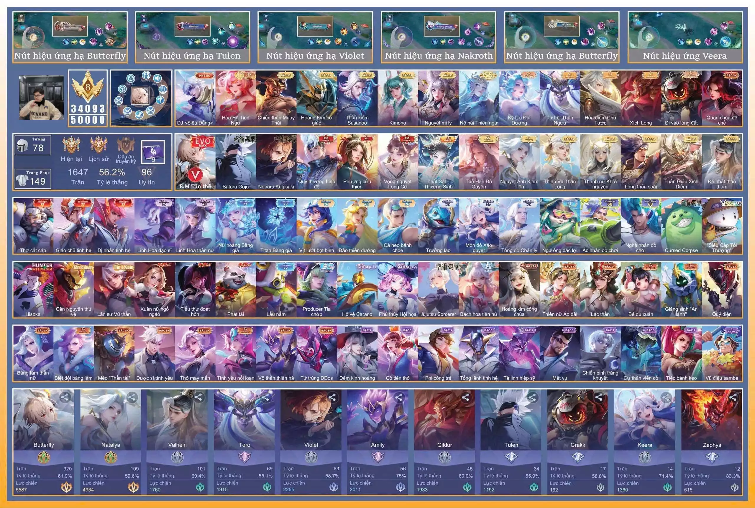 Acc #59974: Butterfly Tận Thế EVO 5 Max, Tulen Satoru Gojo, Nakroth Quỷ Thương Liệp Đế, Violet Vọng nguyệt Long Cơ, Violet Nobara Kugisaki, Butterfly Phượng Cửu Thiên, Raz Chiến thần Muay Thái, Điêu Thuyền Tuế Hàn Đỗ Quyên, giá 6,900,000 đ