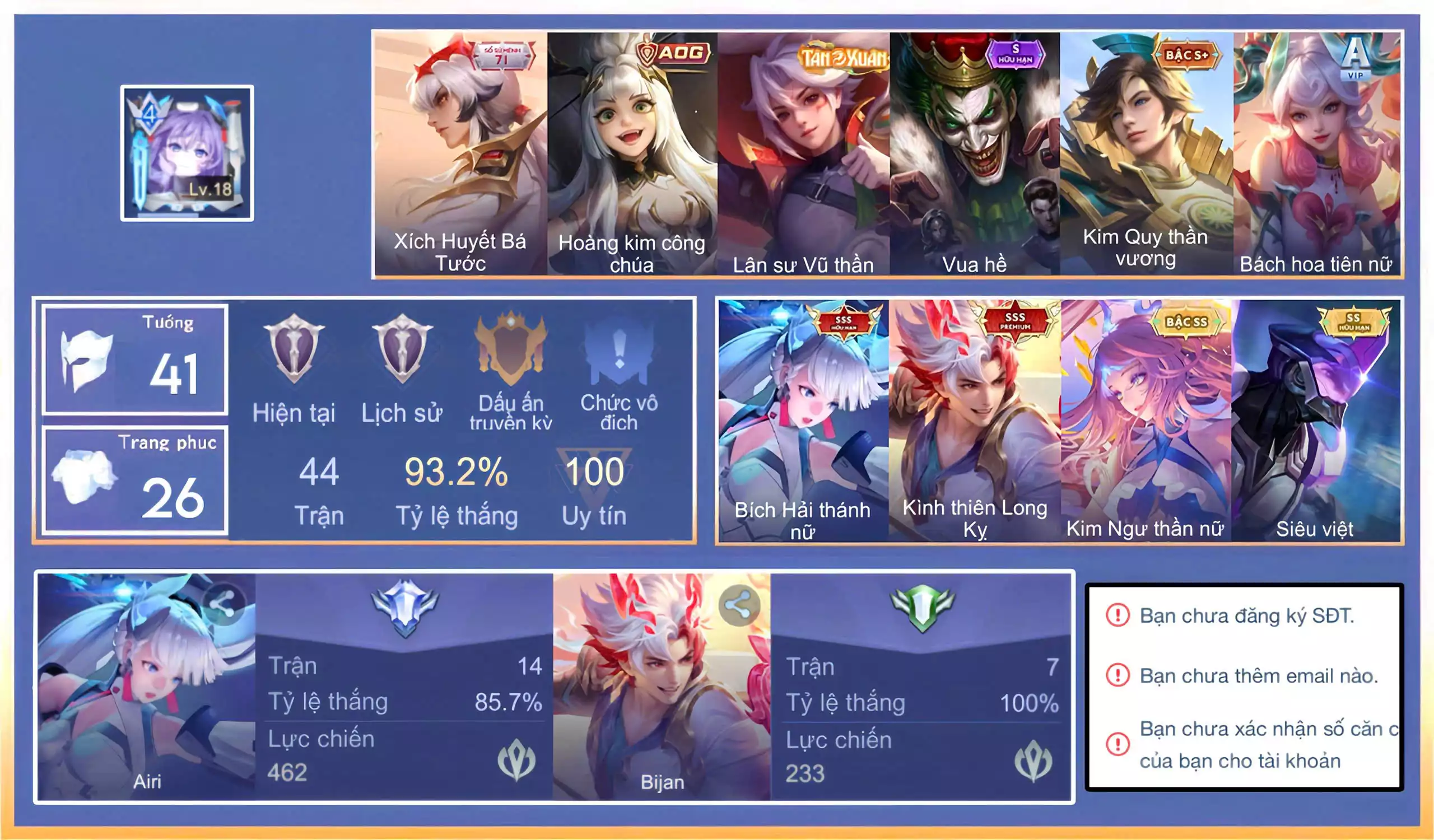 Acc #60014: Airi Bích hải thánh nữ, Bijan Kình thiên Long Kỵ, Butterfly Kim ngư thần nữ, Zephys Siêu việt... Trắng Thông Tin, KLK, giá 1,800,000 đ