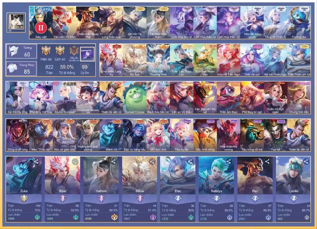 Acc #60015: Bijan Kình thiên Long Kỵ, Billow Thiên Tướng - Độ Ách, Veera Thất Sát - Thượng Sinh, Ngộ Không Tân niên Võ Thần, Elsu Trấn thiên phi hồ, Zata Chí tôn Tà Phượng, Raz Chiến thần Muay Thái, Yena Trấn Yêu Thần Lộc, giá 2,000,000 đ