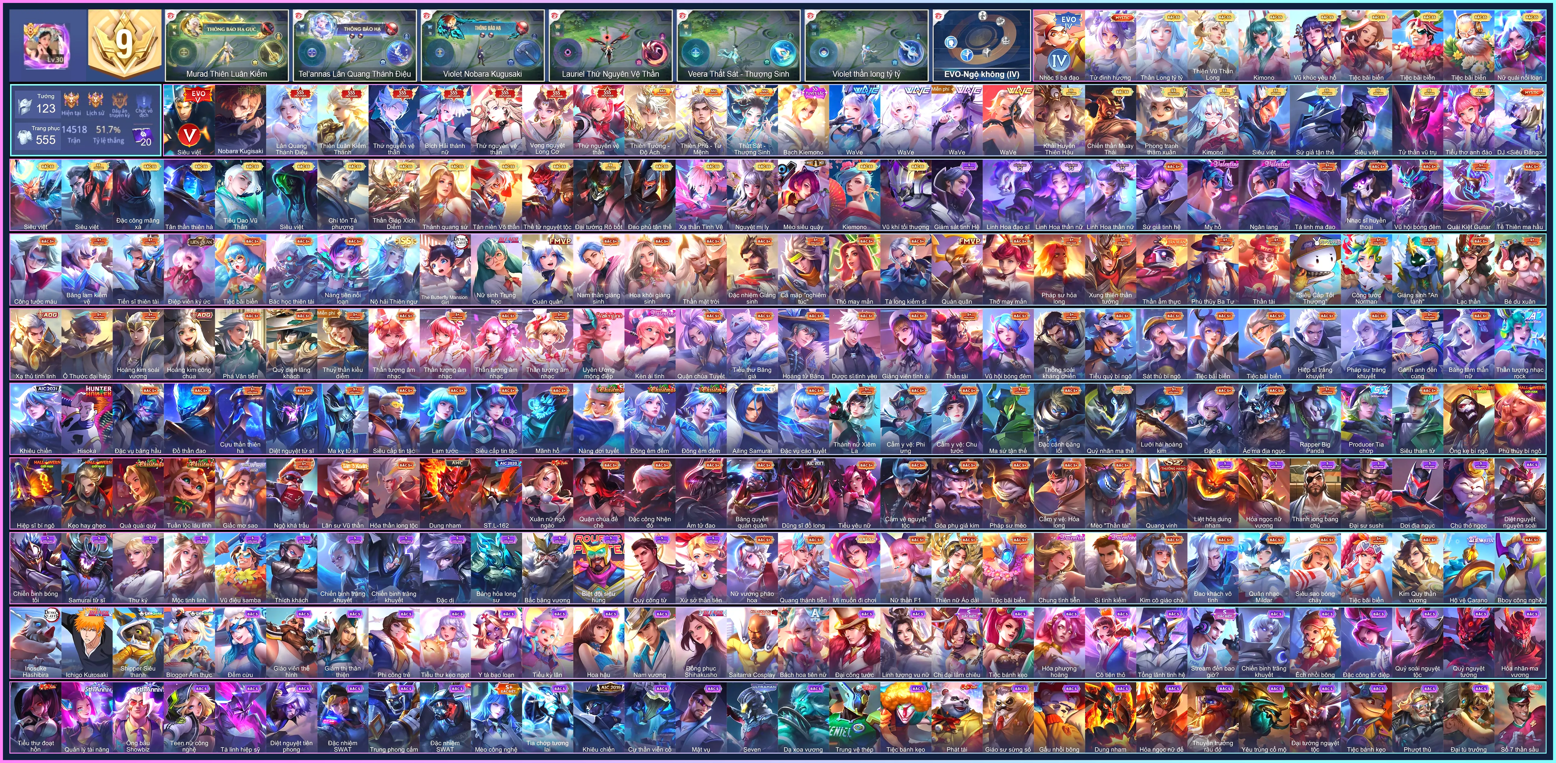 Acc #60703: Lauriel Thứ nguyên vệ thần, Violet Thứ nguyên vệ thần, Violet Vọng nguyệt Long Cơ, Violet Nobara Kugisaki, Nakroth thứ nguyên vệ thần, Murad Thiên Luân Kiếm Thánh, Tel Annas Lân Quang Thánh Điệu, Airi Bích hải thánh nữ, giá 10,750,000 đ