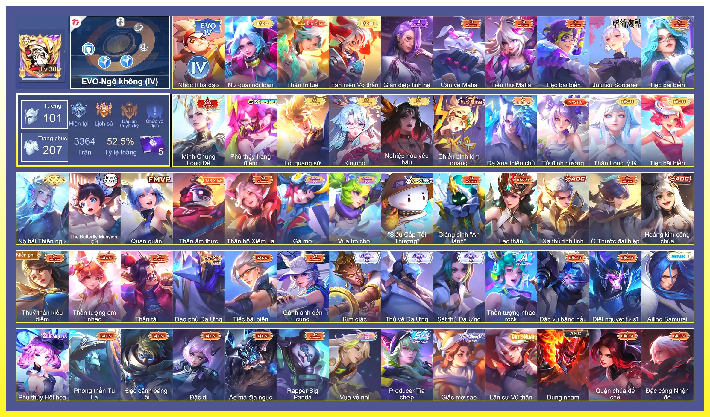 Acc #61696: Butterfly Nữ Quái Nổi Loạn, Violet Thần long tỷ tỷ, Krixi Tiệc Bãi Biển, Natalya nghiệp hỏa yêu hậu, Ngộ Không Tân niên Võ Thần, Veres Kimono, Nakroth Lôi Quang Sứ…, giá 1,650,000 đ