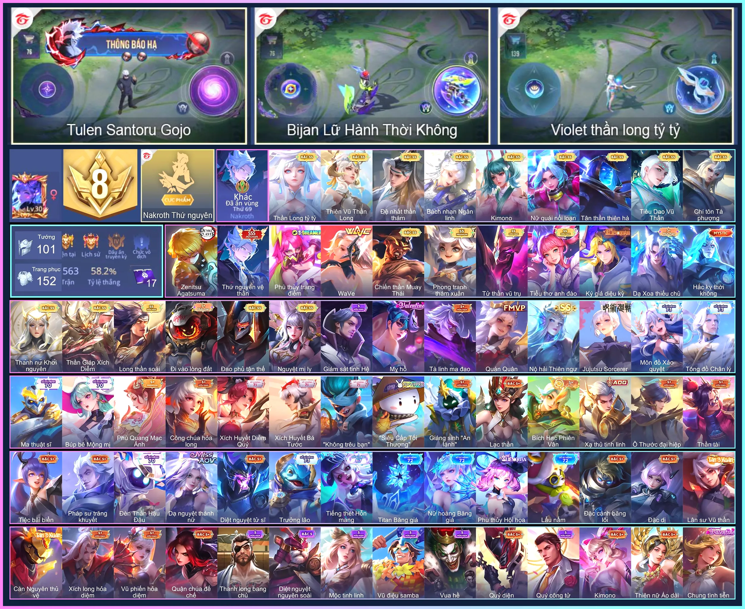 Acc #63078: MÁC THÁCH ĐẤU, Murad Zenitsu Agatsuma, Nakroth thứ nguyên vệ thần, Tulen Tiêu Dao Vũ Thần, Zata Chí tôn Tà Phượng, Hayate Tử thần vũ trụ, Raz Chiến thần Muay Thái, Liliana Nguyệt mị ly, Liliana Tiểu thơ anh đào, Sephera Bách nhạn ngân linh... CHỈ CÀI SDT, giá 4,600,000 đ