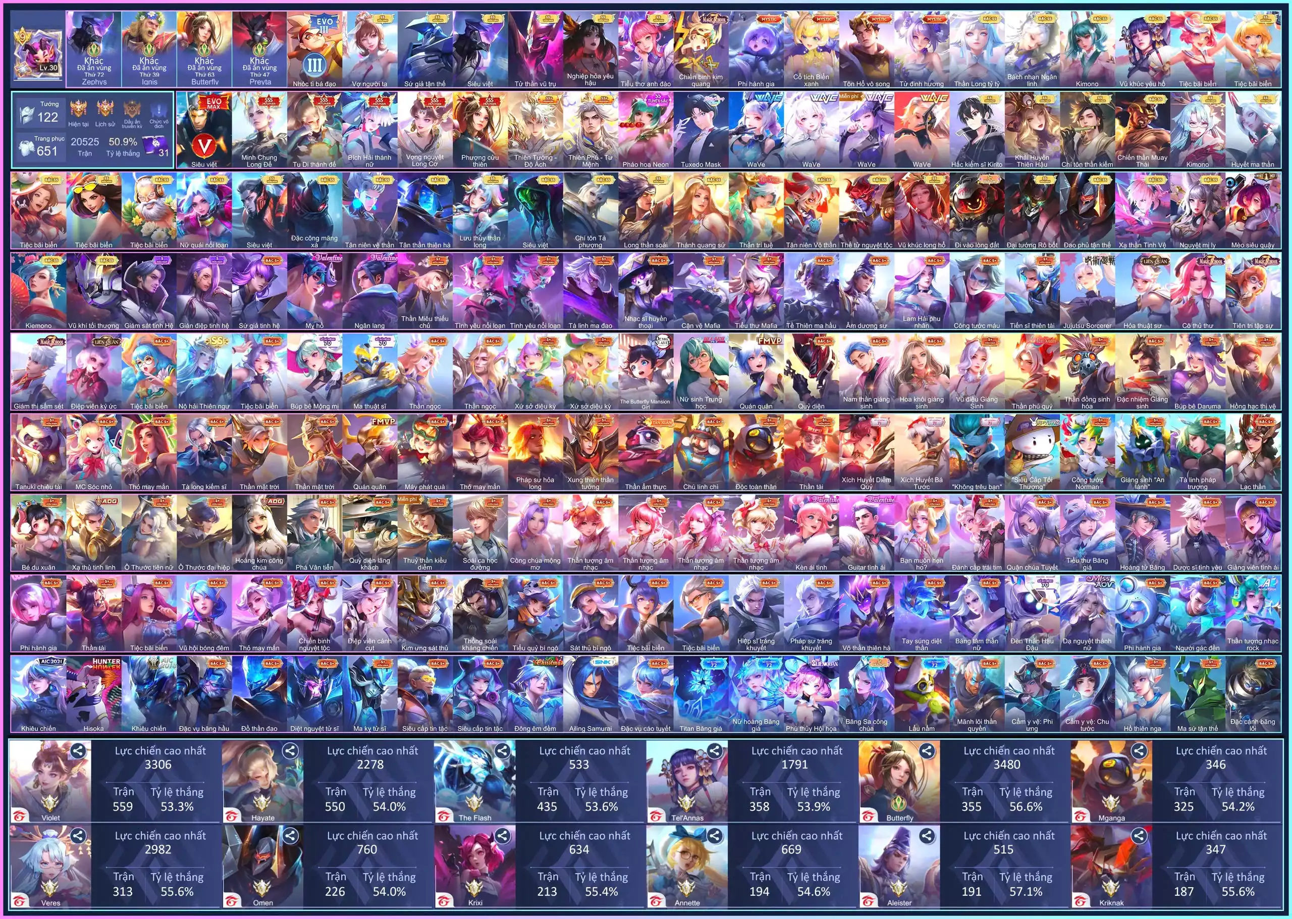 6xx skin + 5SSS : Triệu Vân Minh Chung long đế, Hayate Tudi, Airi Bích Hải, Violet Vọng Nguyệt, Butterfly Phượng Cửu Thiên, Biilow Thiên Tướng, Baron Độ Ách, Full Wave,.. dàn ss xịn