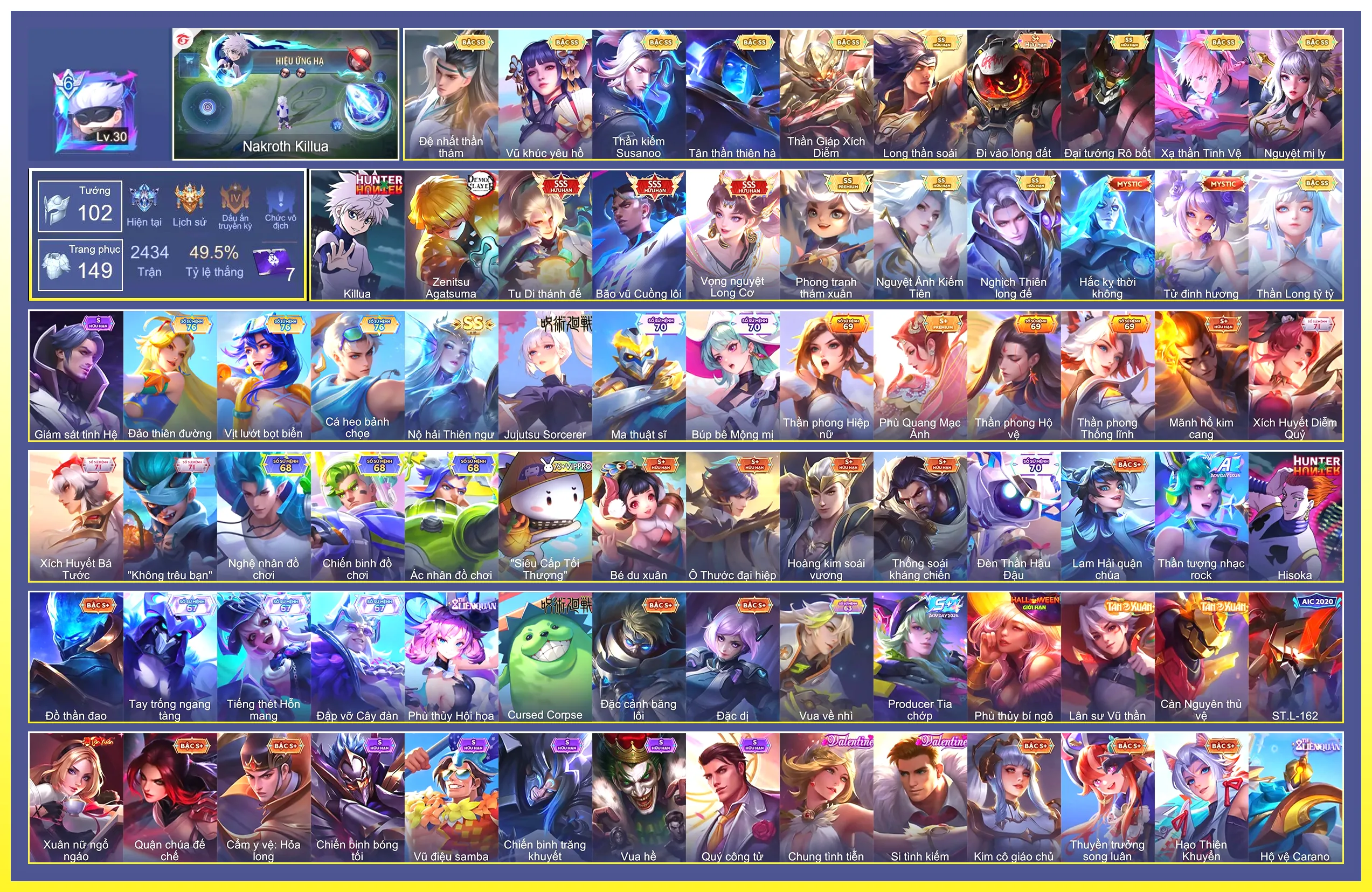 Violet Vọng nguyệt Long Cơ, Hayate Tu Di Thánh Đế, Raz Bão vũ Cuồng lôi,Nakroth Killua, Murad Zenitsu Agatsuma…