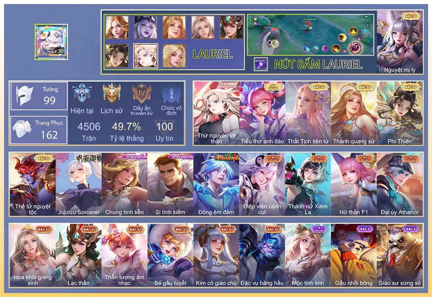 Acc #65975: Lauriel Thứ nguyên vệ thần, Yorn Thế Tử Nguyệt Tộc, Lauriel Thánh quang sứ, Lauriel Phi thiên, Điêu Thuyền Thất Tịch Tiên Tử, Liliana Nguyệt mị ly, Liliana Tiểu thơ anh đào ..., giá 2,000,000 đ