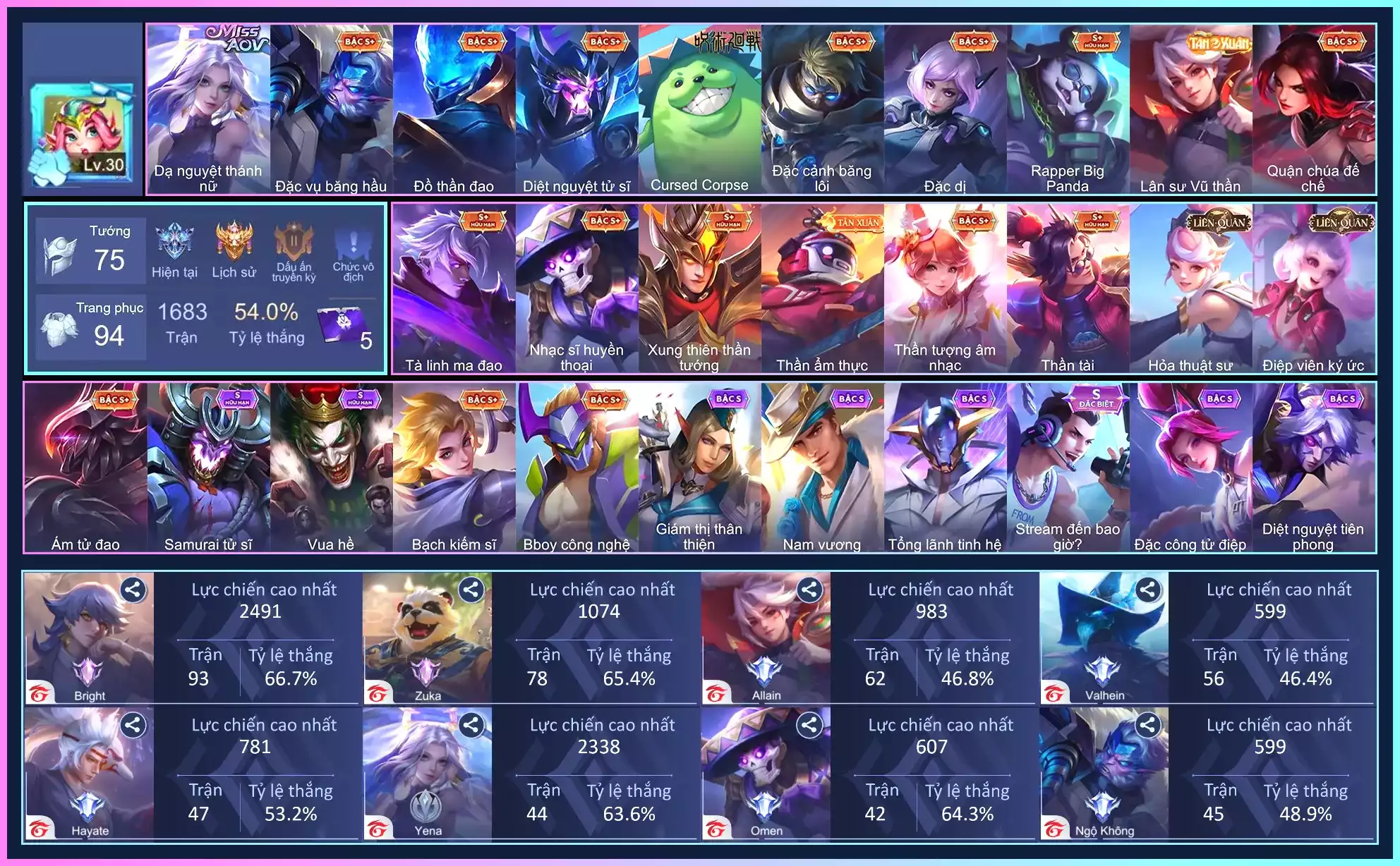 Acc #66483: Yena Dạ Nguyệt Thánh Nữ, Quilen Tà Linh, Xinel Tinh Hệ, Triệu Vân Thần Tài,....Trắng all thông tin, giá 169,000 đ