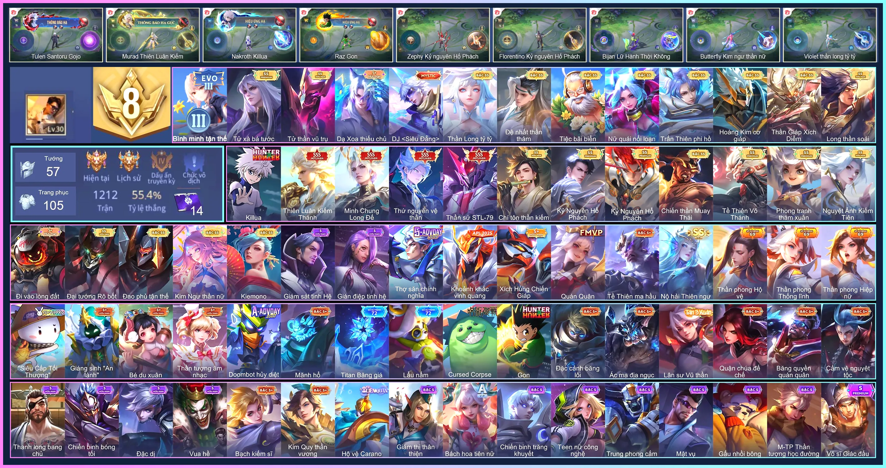 Acc #68112: Raz Gon, Nakroth Killua, Tulen Thần sứ ST.L-79, Nakroth thứ nguyên vệ thần, Triệu Vân Minh Chung Long Đế, Murad Thiên Luân Kiếm Thánh..., giá 6,000,000 đ