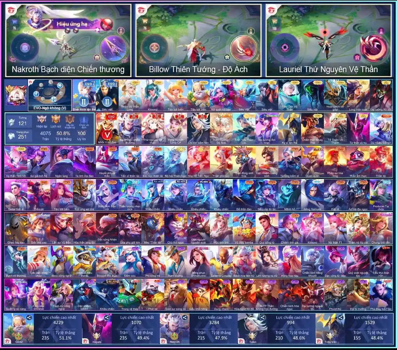 Nakroth Bạch Diện Chiến Thương, Lauriel Vệ Thần, Violet Vọng Nguyệt, Tulen Chí Tôn, Biilow Thiên Tướng, Yena Thần Lộc, Ngộ EVO 5,.. dàn ss xịn