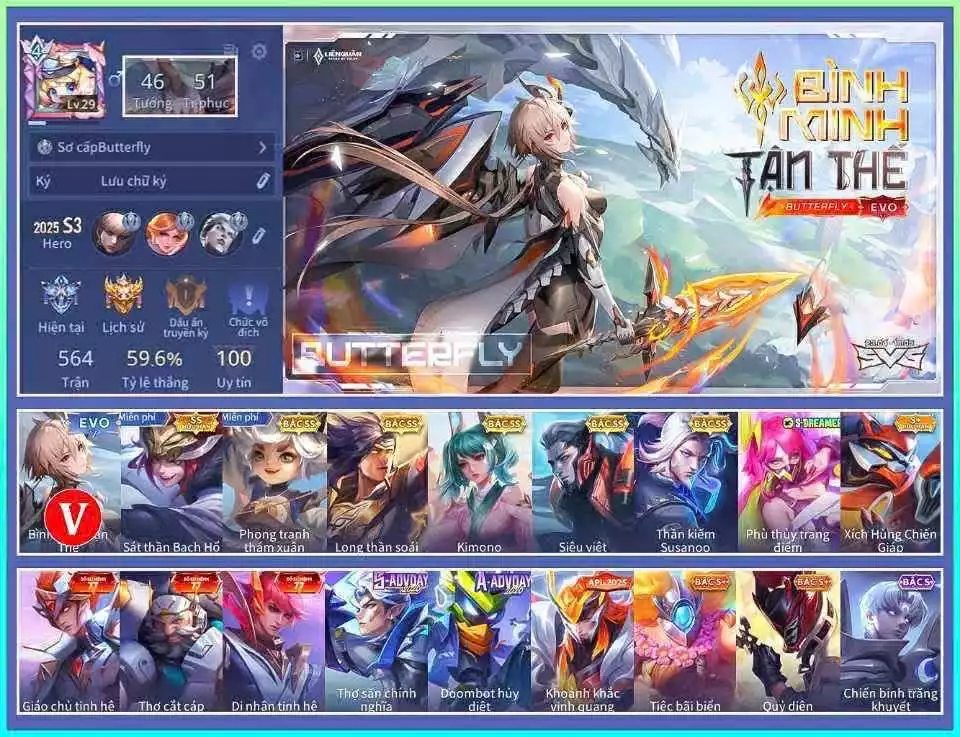Acc #69275: Butterfly EVO V, Enzo Bạch Hổ, Fennick Phong Tranh, Cap Kimono,.., giá 1,500,000 đ
