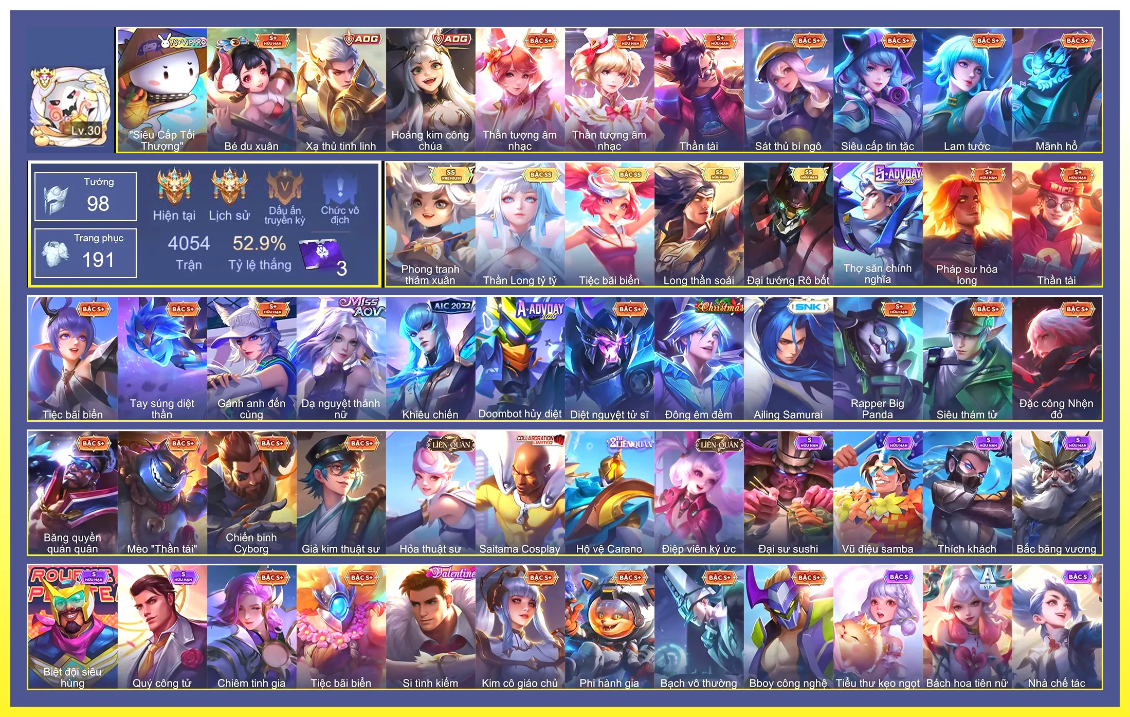 Acc #69339: Krixi Tiệc Bãi Biển, Yorn Long thần soái, Fennik Phong Tranh Thám Xuân, Violet Thần long tỷ tỷ, Maloch Đại Tướng Robot…, giá 650,000 đ
