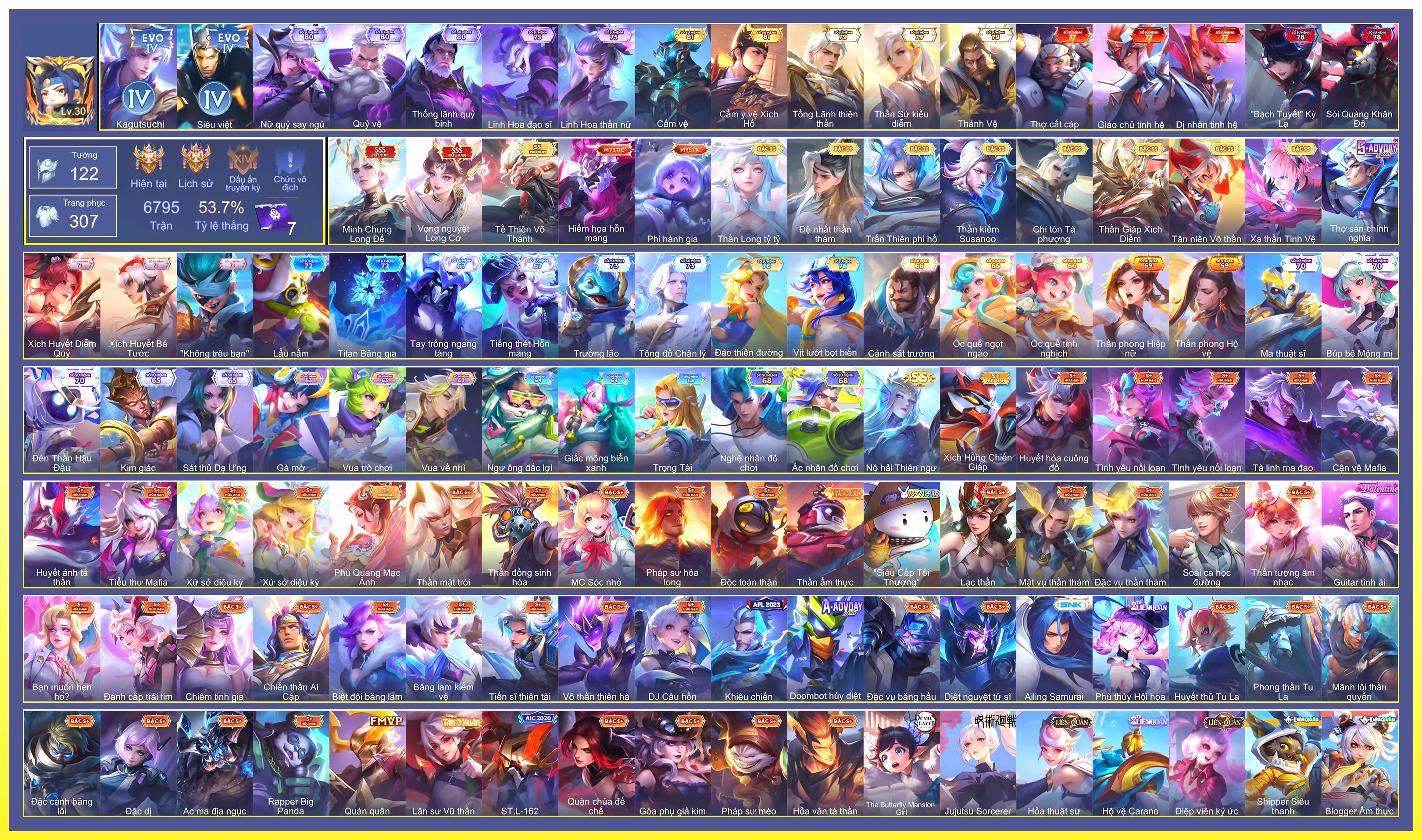 Acc #70069: Valhein Đệ nhất thần thám, Ngộ Không Tân niên Võ Thần, Ngộ Không Thần Giáp Xích Diễm, Ngộ Không Tề Thiên Võ Thánh, Violet Thần long tỷ tỷ, Richter Kiếm thần Susanoo, Laville Xạ Thần Tinh Vệ, Zata Chí tôn Tà Phượng, Elsu Trấn thiên phi hồ, Ilumia Nộ hải Thiên ngư,Triệu Vân Minh Chung Long Đế, Violet Vọng nguyệt Long Cơ…, giá 2,200,000 đ