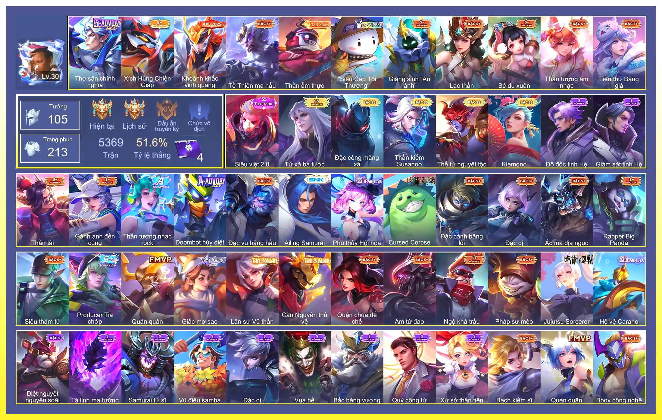 Acc #70072: Yorn Thế Tử Nguyệt Tộc, Paine Tử xà Bá tước, Richter Kiếm thần Susanoo, Airi Kiemono, Quillen Đặc công mãng xà…, giá 800,000 đ