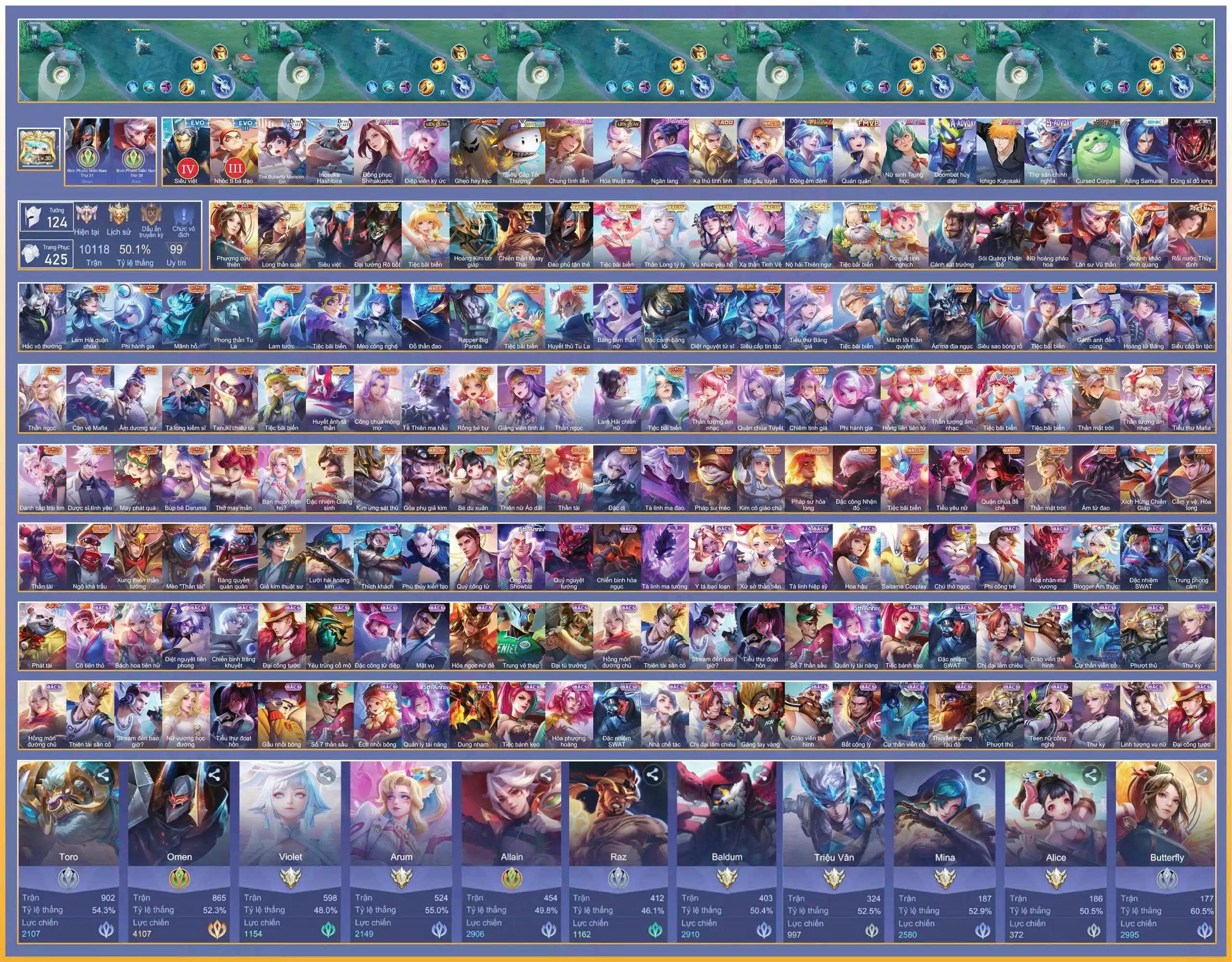 Acc #70110: Butterfly Phượng Cửu Thiên, Yonr Long Thần Soái, Bjian Hoàng Kim, Lavi Tinh Hệ, Raz Thái, Omen Đao Phủ,.., giá 2,000,000 đ