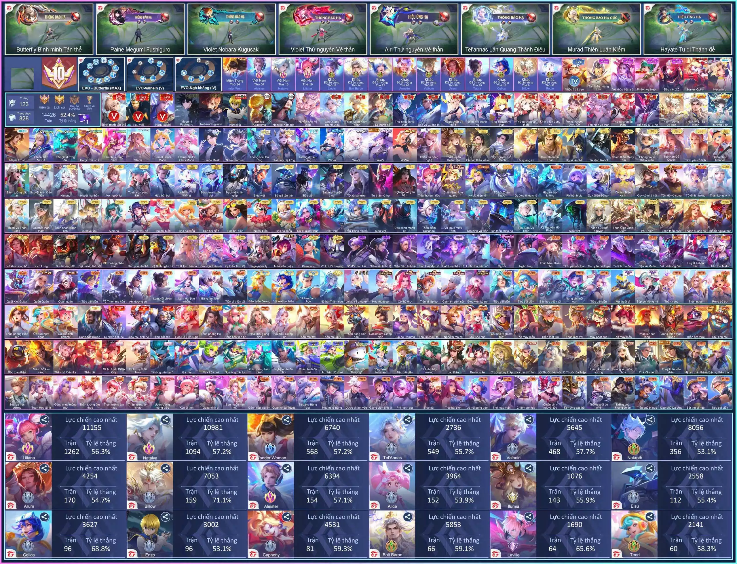Acc #70252: VIP 10 thông tin bảo hành tất cả : 14SSS, Butterfly EVO V, Vanhel EVO V, Paine Megumi, Muzen, Violet Nobara, Kera Nezuko,...dàn ss xịn, giá 30,000,000 đ