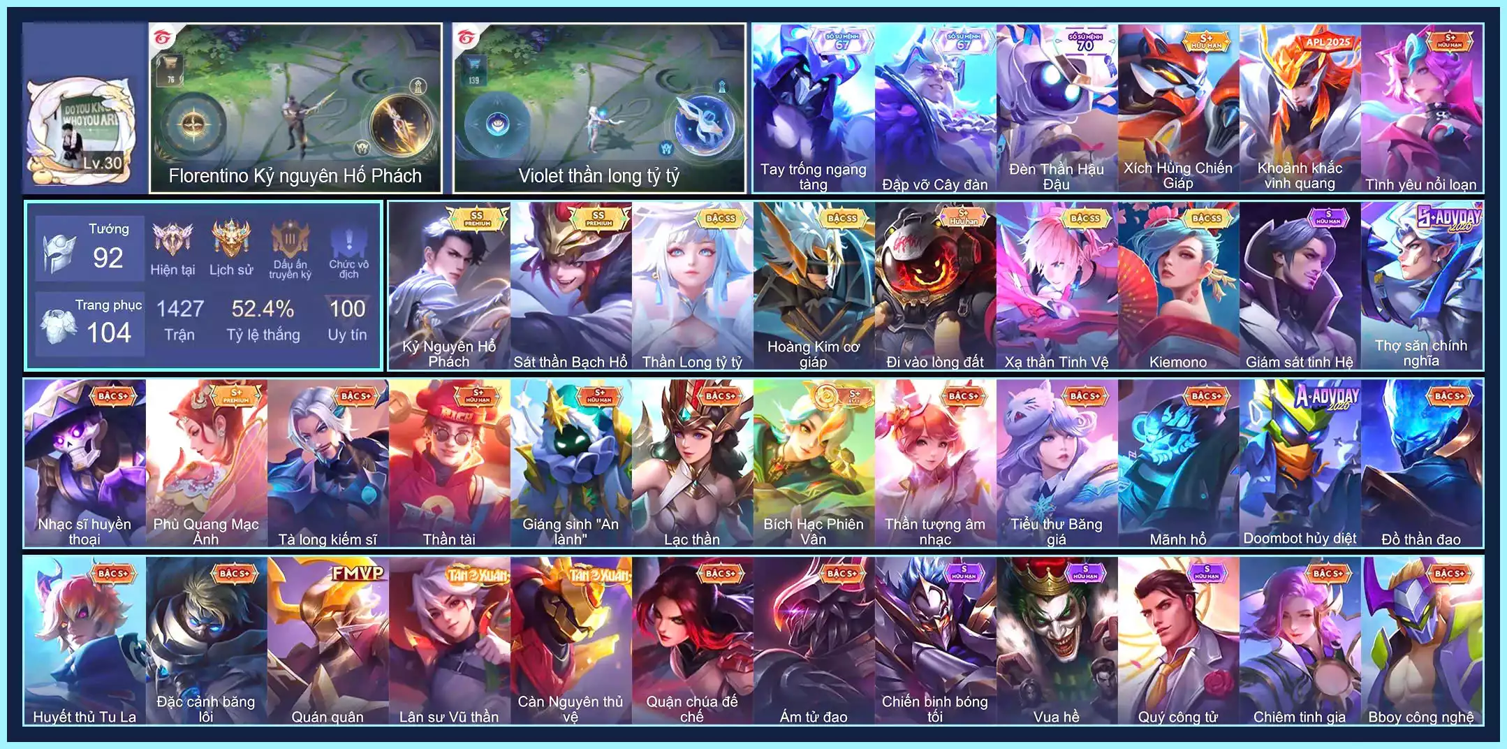 Acc #70837: Violet Thần long tỷ tỷ, Enzo Sát thần Bạch Hổ, Bijan Hoàng kim cơ giáp, Florentino Kỷ Nguyên Hổ Phách, Airi Kiemono, Laville Xạ Thần Tinh Vệ..., giá 700,000 đ
