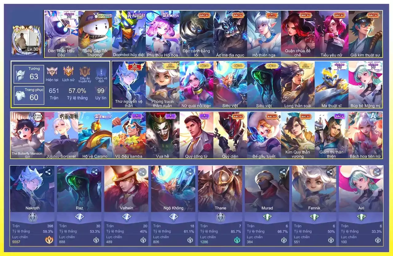 Acc #71249: Nakroth Vệ Thần, Fennick Phong Tranh, Yonr Long Thần Soái, Ngộ Siêu Việt, Raz Siêu Việt .., giá 2,100,000 đ