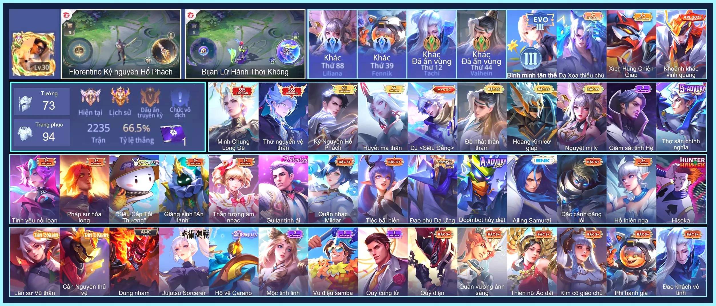 Acc #71321: Triệu Vân Minh Chung Long Đế, Nakroth thứ nguyên vệ thần, Florentino Kỷ Nguyên Hổ Phách, Bijan Hoàng kim cơ giáp... CHỈ CÀI SĐT, giá 3,000,000 đ