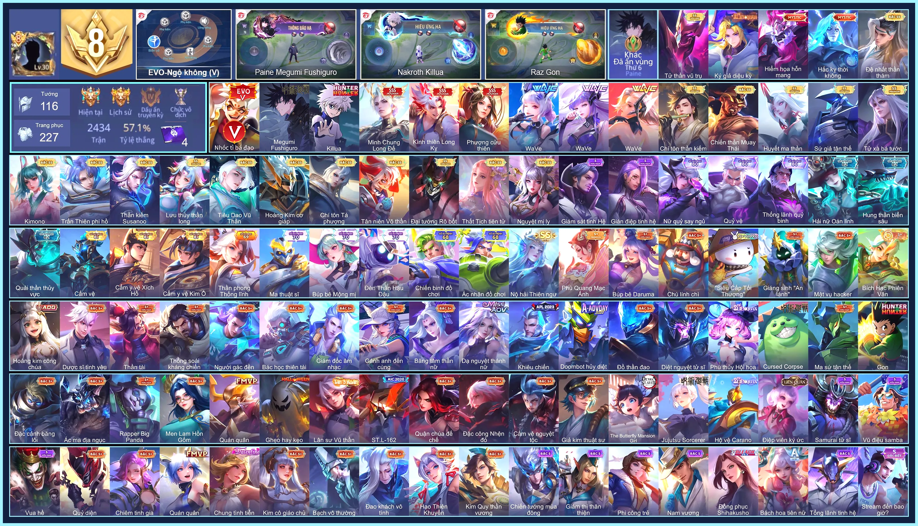 Acc #71328: MÁC CHIẾN THẦN, Nakroth Killua, Raz Gon, Paine Megumi Fushiguro, Butterfly Phượng Cửu Thiên, Triệu Vân Minh Chung Long Đế, Bijan Kình thiên Long Kỵ... GARENA CHỈ CÀI SDT, FB RIP, giá 6,300,000 đ