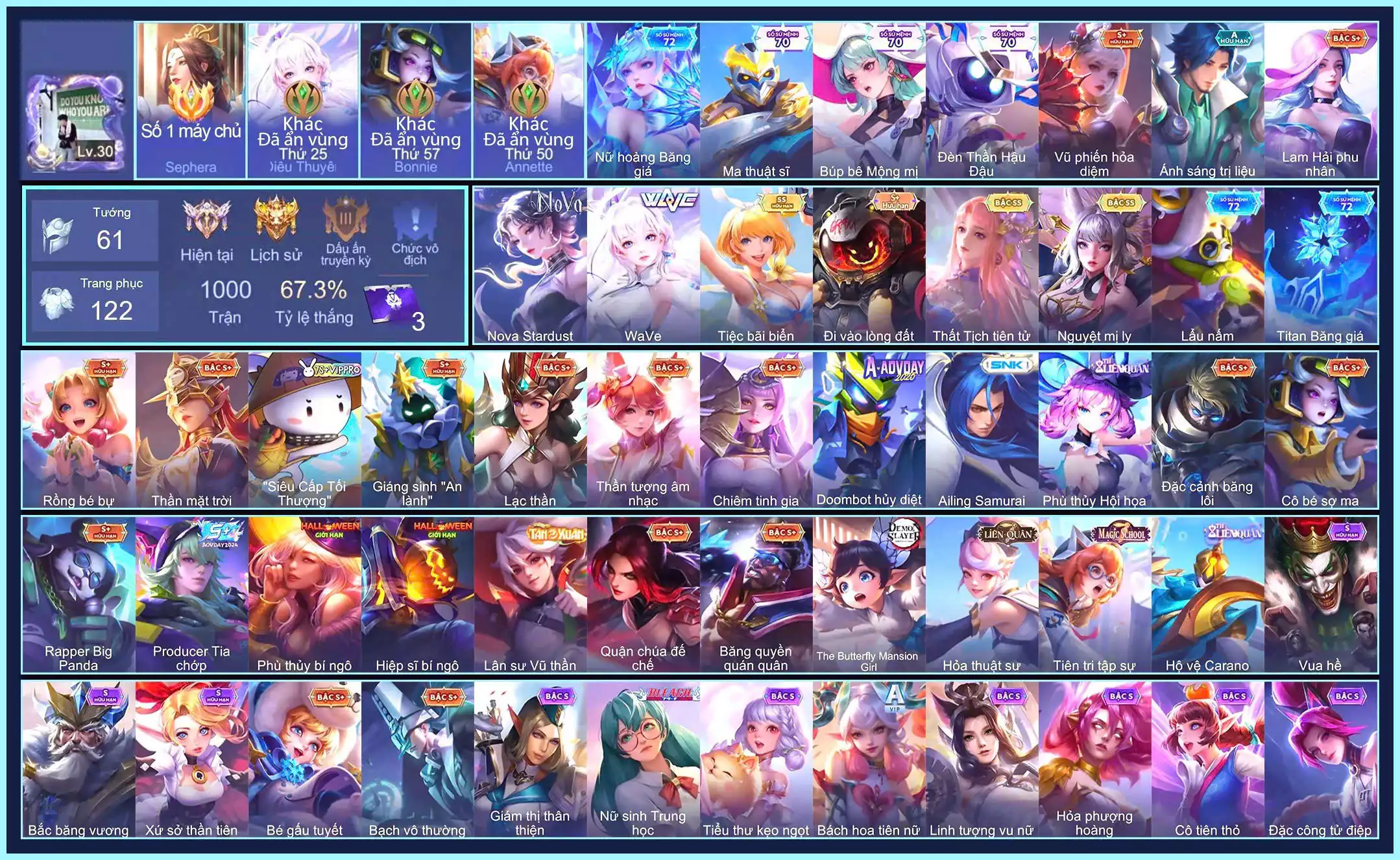 Acc #71337: CHAM NỮ, MÁC CHIẾN THẦN, CỤC VÀNG: sephera NOVA, Violet Tiệc bãi biển, Điêu Thuyền WaVe, Điêu Thuyền Thất Tịch Tiên Tử, Liliana Nguyệt mị ly..., giá 1,300,000 đ