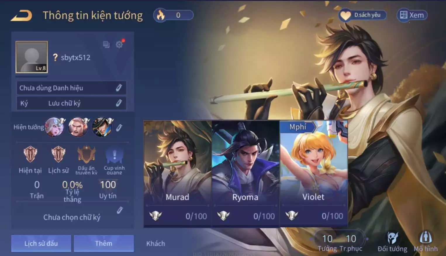 Acc #7817: COMBO: Murad chí tôn, Ryo samurai, Violet tbb, sẵn tướng, trắng thông tin, giá 599,000 đ